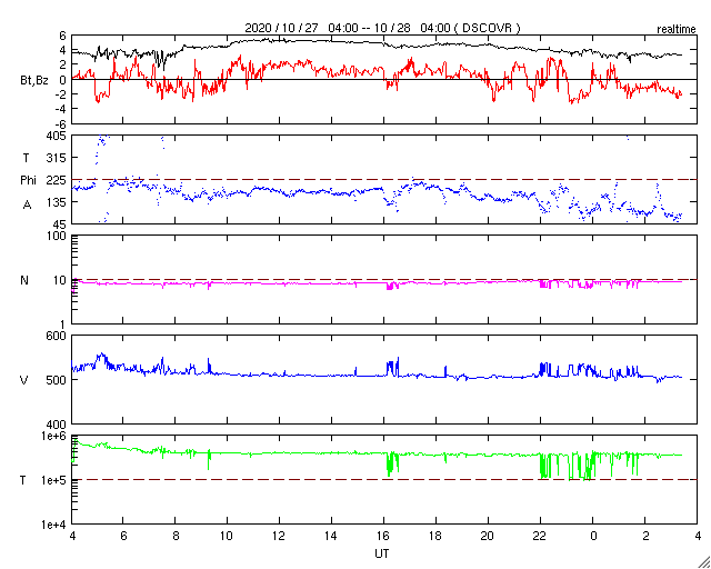 2020/10/24 14:06 高速太陽風が到来し、530km/秒に高まっています。磁気圏の活動も強まっています。