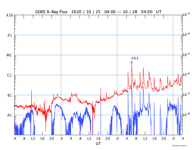 C4.3の小規模フレアが発生しました。太陽風は500km/秒の高速風が続いています。