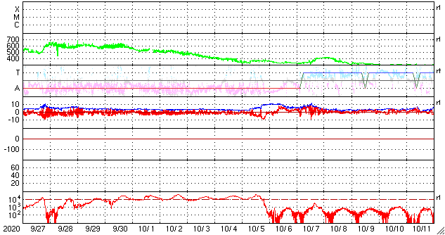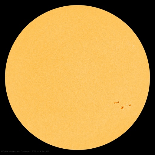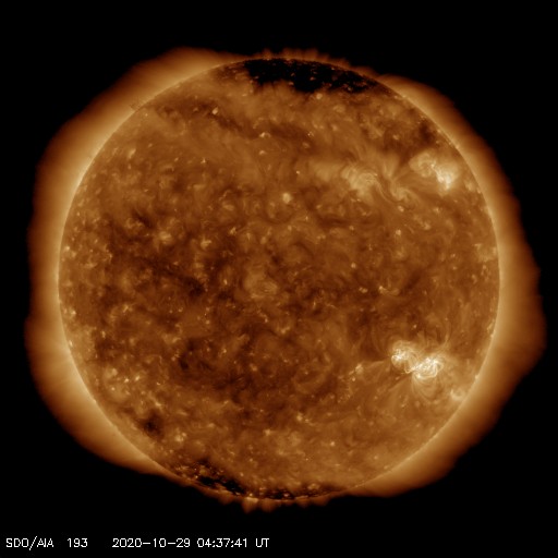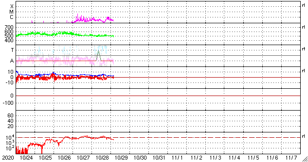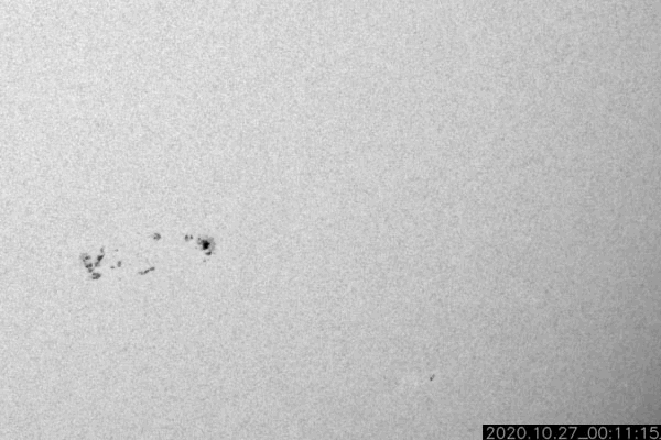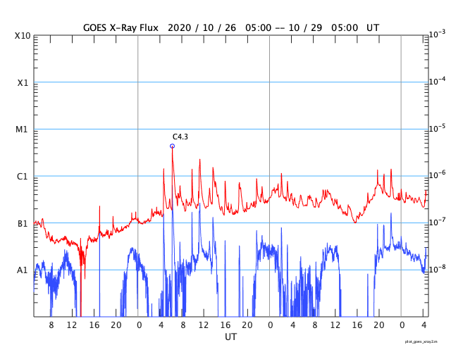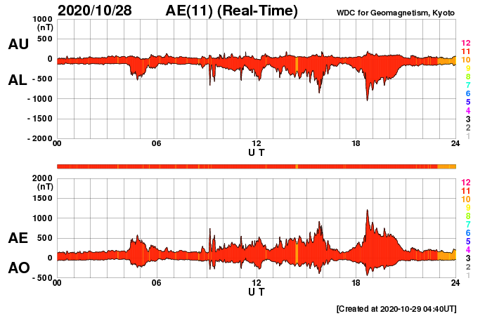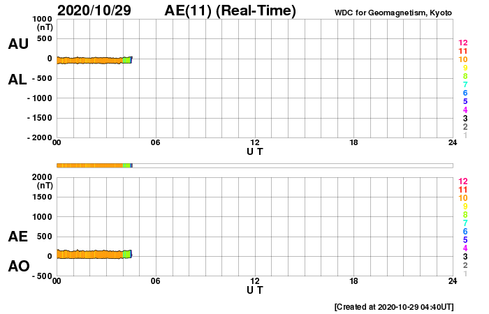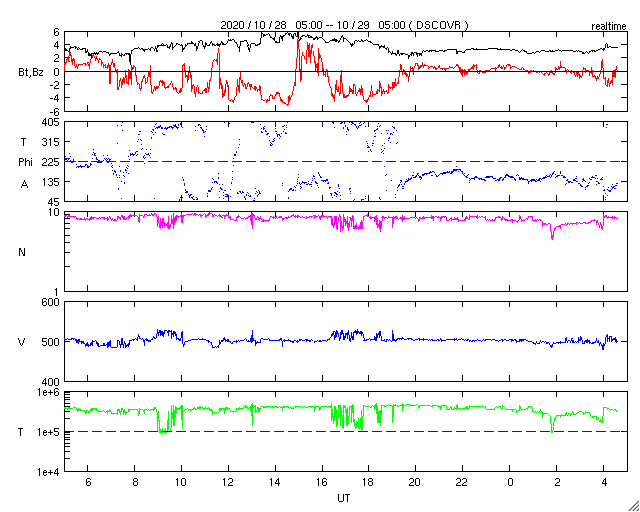 2020/10/29 13:50 更新 新しく2779黒点群が発生しています。500km/秒の高速太陽風が続いています。 担当 篠原 昨夜から、2778黒点群の左上に新しい黒点が現れ、 現在、2779黒点群として大きく見えています。 27日からの2日間の2778、2779黒点群の様子を、 SDO衛星可視光写真の動画で紹介します。 2778群の黒点の形が大きく変化する様子や、 2779群が急に現れる様子をご覧下さい。 2779黒点群では、C1の小規模フレアが3回発生していて、 現在は2778群よりも活動的な様です。 今後の変化に注目してください。 太陽風は、500km/秒の高さに張り付くようにグラフが推移しています。 磁場強度は、3~5nTの間を変化しています。 磁場の南北成分は、グラフの中盤で南寄りに変化しています。 この時間帯に磁気圏の活動が高まり、 AE指数は、500nT程度の中規模の変化から、 最大で1200nTの大きい変化も発生しています。 その後、磁場の南北成分は0nT付近で変化する様になり、 それと共にAE指数の変化は小さくなっています。 27日周期の図を見ると、 前周期の太陽風はもう1日ほど500km/秒台を保ち、 その後、速度が下がっています。 今回もそろそろ高速風は終わるのかもしれません。 放射線帯の高エネルギー電子は、今日も1万を超えています。 この後高速太陽風が終わると、 こちらもゆっくりと減少を始めるでしょう。