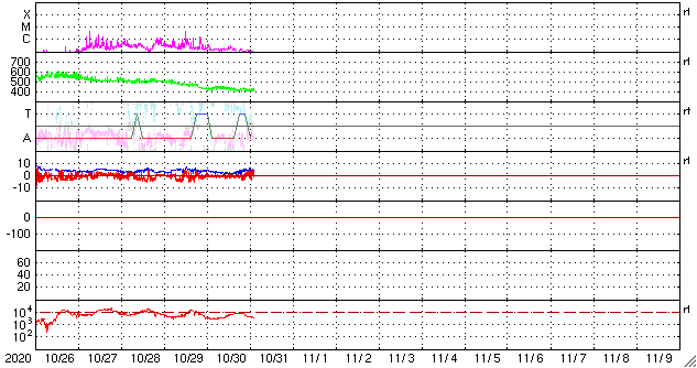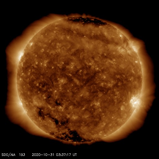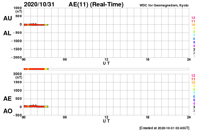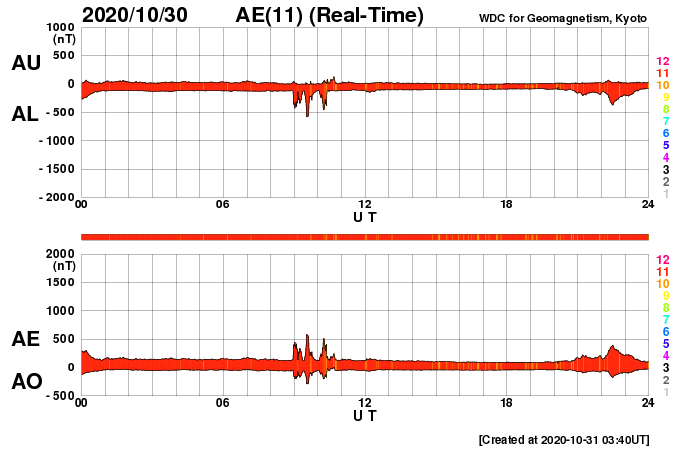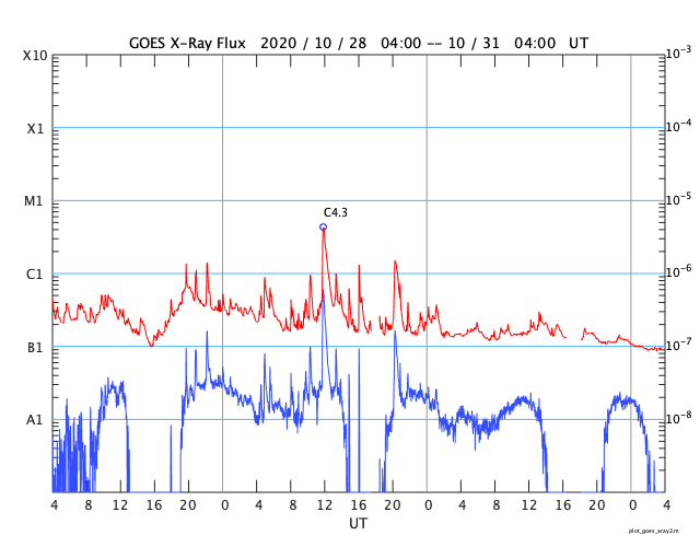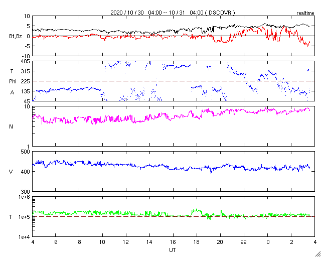 2020/10/31 12:48 更新 太陽は穏やかになっています。太陽風は平均的な状態です。 担当 篠原 2778、2779の2つの黒点群は、 太陽の南西の端にだいぶ近付いています。 昨日のニュース以降は目立った活動はなく、 X線グラフは変化が見られなくなっています。 一方、SDO衛星AIA193の太陽コロナ写真を見ると、 東端の南北に明るい部分があり、 活動的な領域がこちら側に回ってきています。 黒点は現れるでしょうか。 また、STEREO Ahead衛星によると、 南東の端(左下)の更に奥にもうひとつ活動的な領域がある様です。 こちら側に現れるのは3日後くらいになりそうですが、 注目してください。 太陽風は、420km/秒と平均的な速度で安定しています。 磁場強度は3nTから5nTに少し上がって、 こちらも平均的な状態です。 磁場の南北成分は、 グラフの後半で南北に少し変化する様になっています。 磁気圏は穏やかで、AE指数は変化が少なくなっています。 放射線帯の高エネルギー電子はゆっくりと減少が続いていて、 今日は1万を割っています。 この後もゆっくりと下がっていくでしょう。 ![]() SDO衛星のAIA193カメラによる太陽コロナの様子 (c) SDO (NASA) ![]() SDO衛星による太陽の可視光写真。マウスの矢印を写真に重ねると、黒点番号付きの写真に切り替わります。 (c) SDO (NASA) ![]() GOES衛星の太陽X線強度。赤・橙 = 0.1〜0.8 nm、青・紫 = 0.05〜0.4 nm (c) データ:NOAA/SWPC、作図:宇宙天気ニュース ![]() DSCOVRが観測した太陽風の磁場(1番上の枠、黒線は全体の強度、赤線は南北成分) および、太陽風の密度(3番目の紫線)、速度(4番目の青線) (c) データ:NOAA/SWPC、作図:宇宙天気ニュース ![]() AE指数(速報値) 下段のAEグラフの値が高くなると、オーロラ活動が活発化しています。 (c) 京都大学WDC ![]() ![]() 27日の太陽周期に合わせたデータプロット 太陽が同じ面を地球に向けていた27日前の変化から、今後を予想することができます。 (c) 作図:宇宙天気ニュース