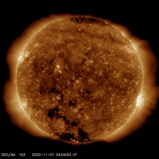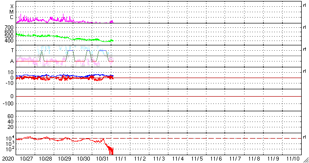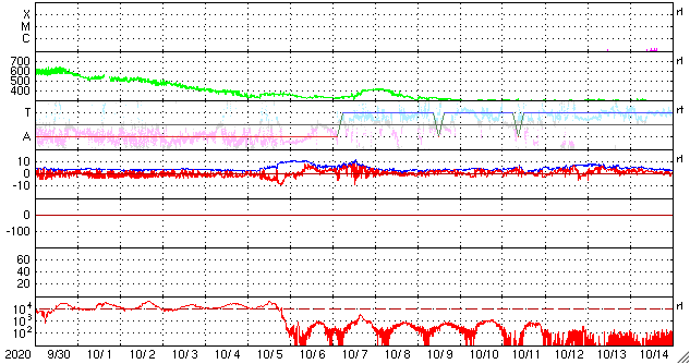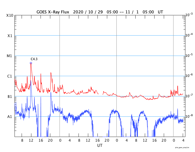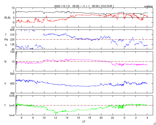 2020/11/ 1 13:21 更新 太陽風は平均的な状態です。2つの黒点群は沈みかけています。 担当 篠原 太陽風は、400km/秒と平均的な速度が続いています。 磁場強度も、4~5nTと平均的です。 磁場の南北成分は、 グラフの前半は南寄りで、後半は北寄りになっています。 AE指数のグラフが停止しているので他のデータを参考にすると、 磁気圏の活動も小規模の活動が見られた状態から、 現在は穏やかになっている様です。 27日周期の図では、 前周期の太陽風は27日前にあたる10月5日から 300km.秒台の低速風に変化しています。 今回もこれから下がっていくのかもしれません。 太陽は、2778、2779黒点群が西の端に達していて、 この後、見えなくなります。 一方、昨日注目していた東端の新しい領域は、 SDO衛星の可視光写真では白斑が見えるだけで、 黒点はありませんでした。 STEREO Ahead衛星によると、 南東の向こう側にもう一つ活動的な領域がある様です。 次は、こちらの出現に注目して下さい。 X線グラフでは、Bクラスの小さいフレアが発生しています。 西の端の2778群で発生している様です。 放射線帯の高エネルギー電子は、 昨夜遅くに大きく減少しています。 この頃に、磁気圏活動の高まりが起きたのではないでしょうか。