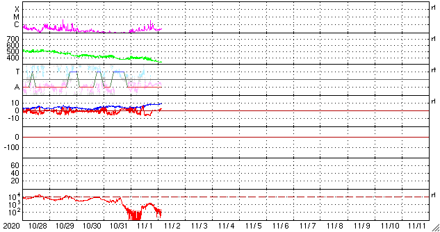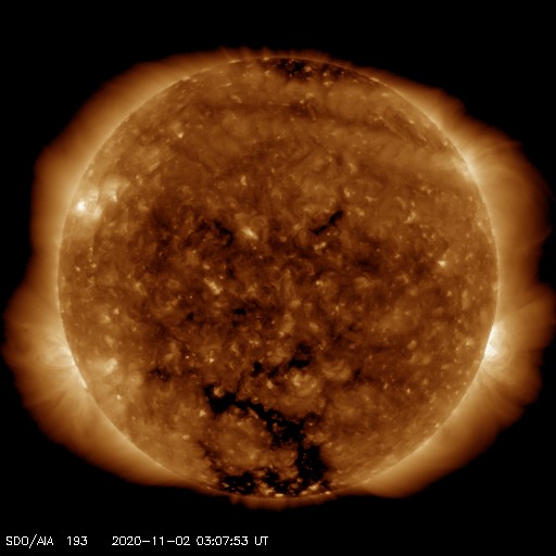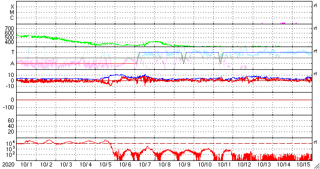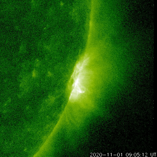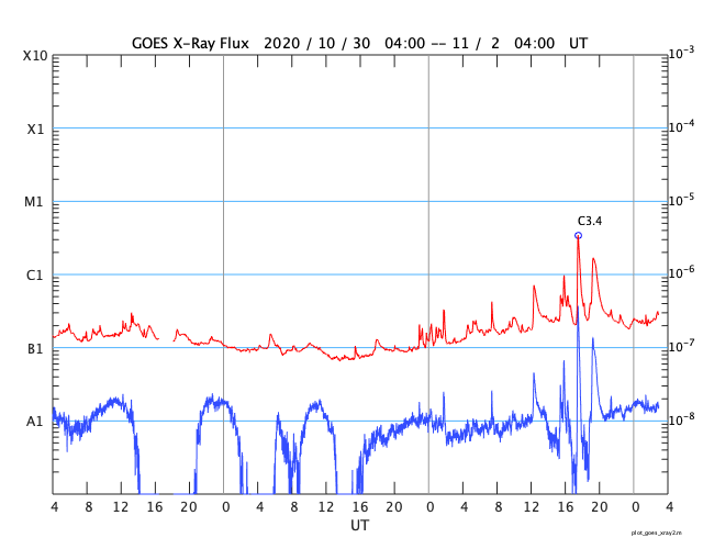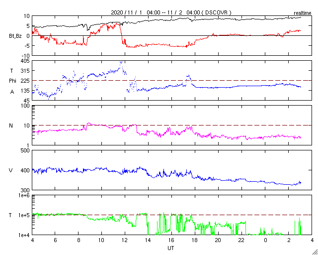 2020/11/ 2 12:17 更新 C3.4の小規模フレアが発生しました。太陽風は低速になっています。 担当 篠原 今日未明、2日2時半(世界時1日17時半)に、 太陽の西の端(右端)に沈みかけていた2779黒点群で C3.4の小規模フレアが発生しました。 SDO衛星AIA94の動画を掲載します。 (普段掲載しているAIA131は、画像が乱れていました) 17時半に活動領域の下寄りで明るく光っているのがこのフレアです。 NOAAの報告では、2779群で発生したとされているのですが、 動画では、その南側にあった2778群で発生している様にも見えます。 直後の2日4時(世界時1日19時)にも、 少し上側でC1.6の小規模フレアが発生しています。 発生場所は2779群です。 2778、2779黒点群は太陽の西の端に沈んで見えなくなりましたが、 東端(左端)の北半球側に新しい黒点が現れています 太陽は無黒点にはならなかった様です。 また、東端の南半球側では、 活動的な領域が向こう側から近づいています。 明日には姿を現しそうです。 黒点はできているでしょうか。 太陽風は、昨夜遅くから速度が低下を始めて、 現在は320km/秒の低速風になっています。 27日周期の図の前周期と同じ様な推移になりました。 磁場強度は、5nTから9nTに少し強まっています。 南北成分は、磁場の強まり始めに -5nTの南向きがしばらく続きました。 速度は低速になり始めていましたが、 磁気圏の活動は少し高まった様です。 その後は、磁場は0nT付近で推移する様になり、 磁気圏も穏やかになっています。 前周期を参考にすると、 これからしばらく300km/秒台の低速の太陽風が続きそうです。