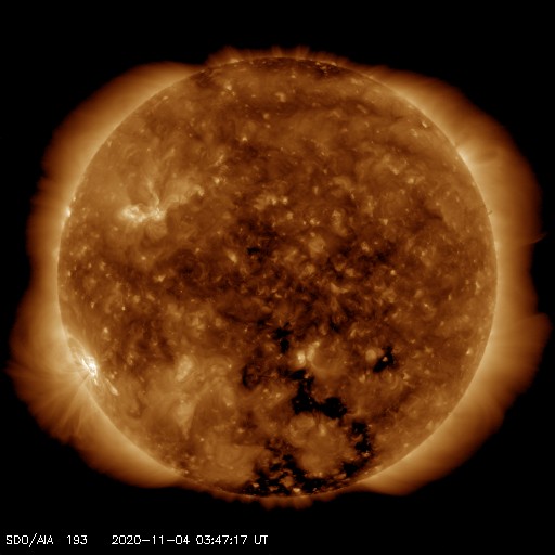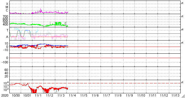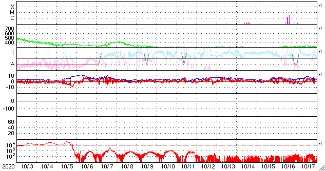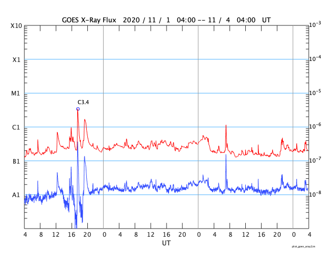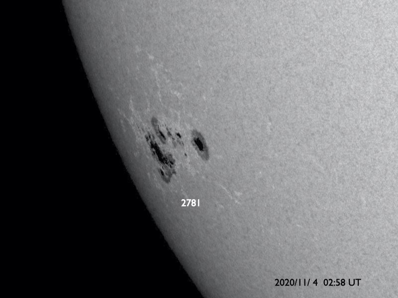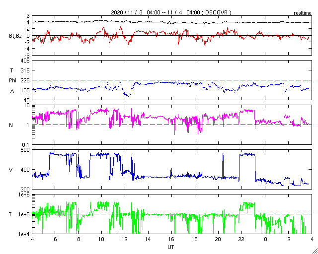 2020/11/ 4 13:02 更新 2781群でC1.1の小規模フレアが発生しました。太陽風は低速に戻っています。 担当 篠原 太陽の南東(左下)の黒点は、2781群と番号が付けられました。 今日は全体の姿が見えるようになっています。 この領域で、昨日の午後、3日16時(世界時3日7時)に、 C1.1の小規模フレアが発生しました。 今のところ目立った活動はこの小さいフレア程度で、 2781群の活動は特に高まってはいません。 また、今朝、4日6時(世界時3日21時)に、 北東側の2780群の領域で、B4.7の小さいフレアが発生しています。 規模は小さいですが、 弱いCME(コロナ質量放出)が飛び出しているかもしれません。 太陽の中央部の南半球側に小さい黒点が発生している様です。 番号が付けられる様な規模に成長するでしょうか。 太陽風は、速度のデータが乱れていますが、 グラフの中盤までは360km/秒程度で推移して、 後半になると320km/秒へ下がっています。 400km/秒近くへの弱い高まりは終わって、低速の風に戻っています。 磁場強度は4nTと平均的な状態で、 南北成分は0nT付近で推移しています。 このため、磁気圏は穏やかです。 掲載している27日周期の図では、 前周期の太陽風は グラフの最後まで300km/秒付近の低速の風が続いています。 SDO衛星AIA193では、低緯度域にコロナホールは見られず、 今回も同様に低速の太陽風が続きそうです。 ![]() 太陽の南東(左下)の2781黒点群。SDO衛星。 (c) SDO (NASA)、作図:宇宙天気ニュース ![]() SDO衛星のAIA193カメラによる太陽コロナの様子 (c) SDO (NASA) ![]() SDO衛星による太陽の可視光写真。マウスの矢印を写真に重ねると、黒点番号付きの写真に切り替わります。 (c) SDO (NASA) ![]() GOES衛星の太陽X線強度。赤・橙 = 0.1〜0.8 nm、青・紫 = 0.05〜0.4 nm (c) データ:NOAA/SWPC、作図:宇宙天気ニュース ![]() DSCOVRが観測した太陽風の磁場(1番上の枠、黒線は全体の強度、赤線は南北成分) および、太陽風の密度(3番目の紫線)、速度(4番目の青線) (c) データ:NOAA/SWPC、作図:宇宙天気ニュース ![]() 27日の太陽周期に合わせたデータプロット 太陽が同じ面を地球に向けていた27日前の変化から、今後を予想することができます。 (c) 作図:宇宙天気ニュース