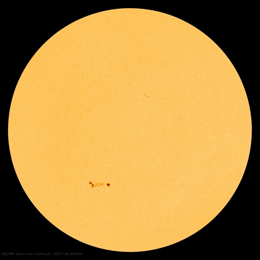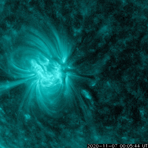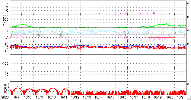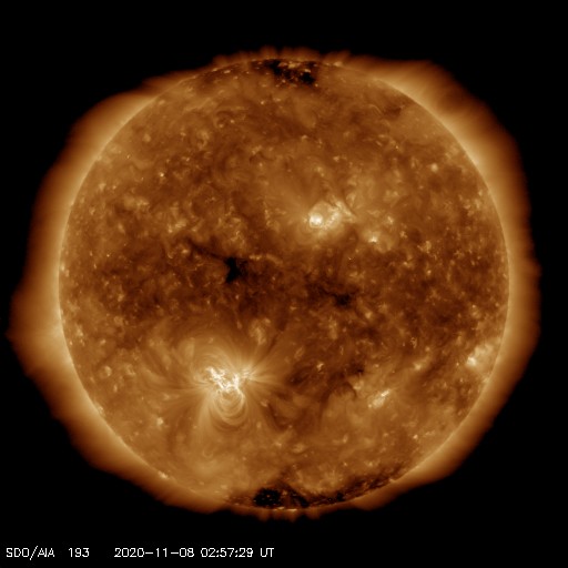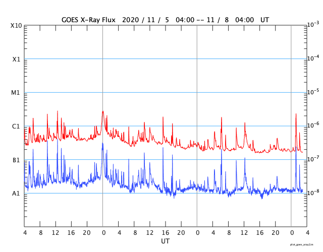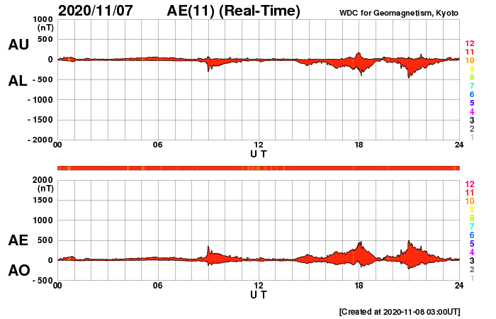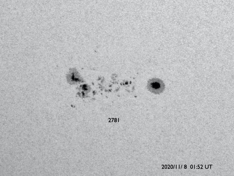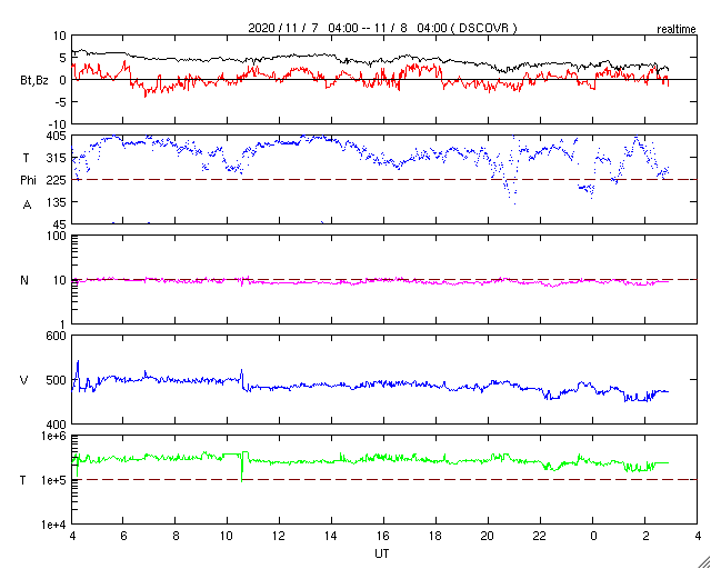 2020/11/ 8 12:10 更新 2781群でCクラスのフレアが続いています。太陽風は再び高速になりました。 担当 篠原 昨日のニュース以降も、 2781黒点群では、C1.8、C2.3の小規模フレアや Bクラスの小さいフレアが発生しています。 活動の様子をSDO衛星AIA131の動画で紹介します。 小さい輝きが頻繁に発生しています。 2枚目にSDO衛星による拡大写真を掲載します。 黒点群の広がりは大きいままですが、 中に見える黒点は昨日よりも小さくなっている様です。 この後縮小して行くのでしょうか。 北半球の2780群は、昨夜くらいに一旦見えなくなって、 再び出現しています。 現在は昨日よりも大きく見えています。 SDO衛星AIA193によると、 昨夜、7日21時(世界時7日12時)に、 この領域でコロナのガスを吹き飛ばす様な 小さい爆発が発生しています。 弱いCME(コロナ質量放出)が起きているかもしれません。 太陽風は、昨日のニュースの後に再び500km/秒に高まり、 高速の状態に戻りました。 夜になるとゆっくりと下がり始め、現在は460km/秒くらいです。 27日周期の図を見ると、前周期は300km/秒の低速風だったところに、 高速太陽風が2日にわたって続いています。 太陽風磁場の南北成分は、0nT付近で小さく南北に変化しています。 AE指数は300~500nTの小規模の変化が3回ほど発生していて、 やや活動的な状態です。