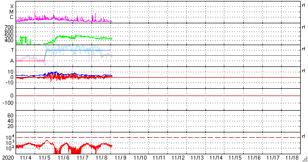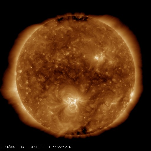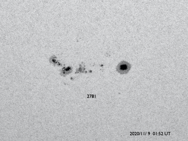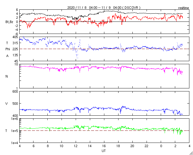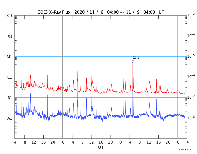 2020/11/ 9 12:11 更新 2781群でC5.7の小規模フレアが発生しました。太陽風は平均的な速さに戻りそうです。 担当 篠原 2781黒点群は、昨日の午後、8日14時(世界時8日5時)に C5.7の小規模フレアを起こしました。 その後もBクラスの小さいフレアが発生しています。 可視光写真では、黒点は昨日よりも少なくなっています。 全体としては縮小が続いている様です。 北半球の2780群は、現在は見えなくなっています。 STEREO Ahead衛星によると、 この後、南半球側の東端(左端)から 活動的な領域がこちら側に回ってくる様です。 今度はどの様な活動になるでしょうか。 太陽風は、今朝まで450km/秒前後で推移していましたが、 その後、速度が下がり始めていて、 400km/秒と平均的な状態に戻りそうです。 磁場強度は、4nT前後と平均的な値で推移しています。 南北成分は、グラフの中盤までは南北に小さく変化していましたが、 後半は弱い北寄りになっています。 AE指数のグラフも、 途中までは小規模の変化が数時間おきに発生していますが、 後半は静かになっています。 SDO衛星AIA193では、コロナホールは特に見られず、 太陽風は穏やかな状態になりそうです。 ![]() 2781黒点群の可視光写真。SDO衛星。 (c) SDO (NASA)、作図:宇宙天気ニュース ![]() SDO衛星のAIA193カメラによる太陽コロナの様子 (c) SDO (NASA) ![]() SDO衛星による太陽の可視光写真。マウスの矢印を写真に重ねると、黒点番号付きの写真に切り替わります。 (c) SDO (NASA) ![]() GOES衛星の太陽X線強度。赤・橙 = 0.1〜0.8 nm、青・紫 = 0.05〜0.4 nm (c) データ:NOAA/SWPC、作図:宇宙天気ニュース ![]() DSCOVRが観測した太陽風の磁場(1番上の枠、黒線は全体の強度、赤線は南北成分) および、太陽風の密度(3番目の紫線)、速度(4番目の青線) (c) データ:NOAA/SWPC、作図:宇宙天気ニュース ![]() AE指数(速報値) 下段のAEグラフの値が高くなると、オーロラ活動が活発化しています。 (c) 京都大学WDC ![]() ![]() 27日の太陽周期に合わせたデータプロット 太陽が同じ面を地球に向けていた27日前の変化から、今後を予想することができます。 (c) 作図:宇宙天気ニュース