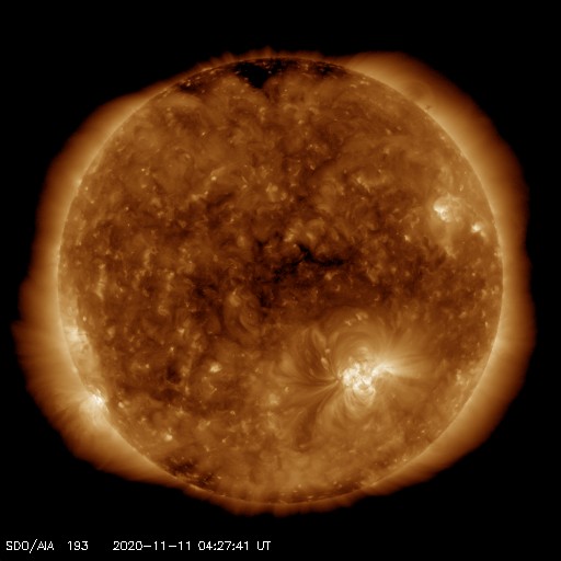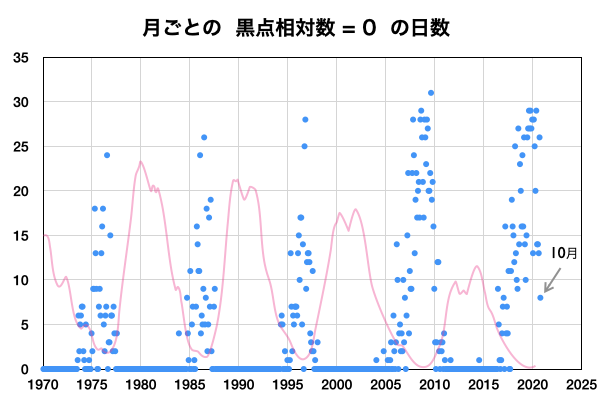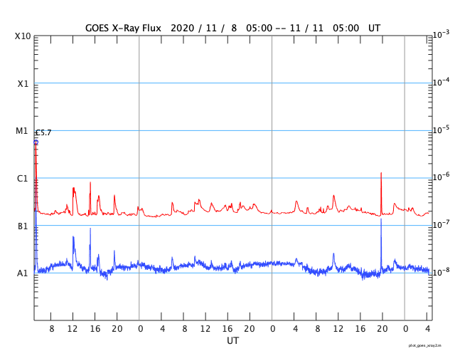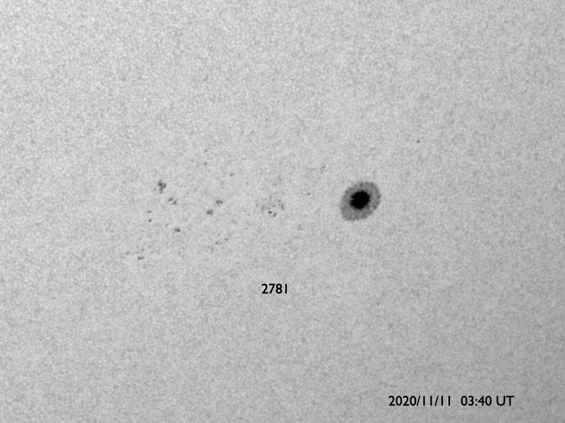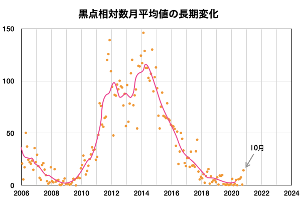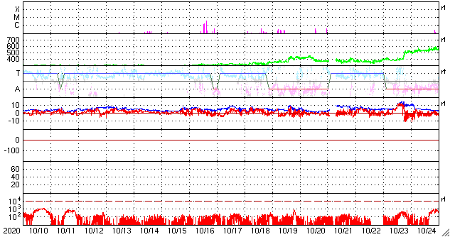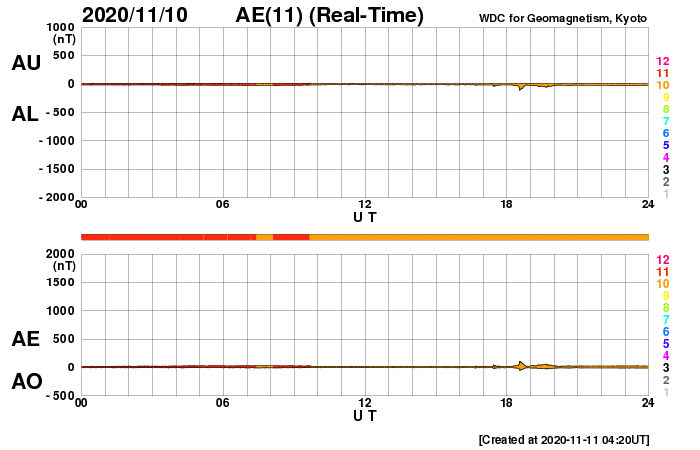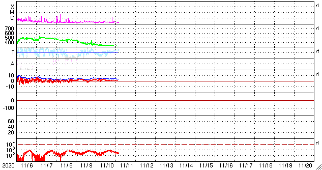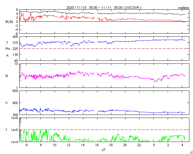 2020/11/11 13:39 更新 太陽風は更に低速になっています。10月の黒点相対数は 14.4 でした。 担当 篠原 2781黒点群の活動が続いたため紹介が遅くなりましたが、 WDC-SILSOより、10月の黒点相対数の月平均値は 14.4 と発表されました。 黒点相対数の月平均値が2桁に達したのは、 第25活動周期としては初めてです。 第24期最後の2桁は2018年6月の15.6だったので、 月平均値が2桁になったのは2年4か月ぶりです。 1枚目の図では、グラフの最後で飛び出すように 10月の点が少し高いところに表示されています。 9月は 0.7 と1未満の値に下がっていたので、 続く10月の記録に注目していたのですが、 最初の1週間は無黒点が続いたものの、 8日以降は無黒点になったのは13日の1回だけで、 後半になると2778、2779群の出現もあり、 日毎の黒点相対数が30台、40台に達する日もありました。 一方、10月の無黒点の日は、8日と1桁台に下がっています。 これも2018年6月以来です。 フレアの発生も増えてきて、 太陽の活動が少しずつ高まっていることを感じます。 今日の太陽は、2781黒点群の左側の小さい黒点たちが一気になくなり、 右側の大きい黒点だけが目立つ様になっています。 X線グラフは、C1.3の小規模フレアがぽつんと発生しているだけで、 活動も弱くなっています。 南東の端(左下)の黒点は全体が見える様になってきました。 この後、どのような活動になるのでしょうか。 太陽風は320km/秒へ速度が下がり、更に低速になっています。 磁場強度は、5nT前後と平均的な状態で推移しています。 磁場の南北成分は、弱い北向きが続いています。 磁気圏はとても穏やかで、 AE指数はほとんど変化がありません。 磁場の南北成分は、グラフの最後で0nTに下がっています。 この後、南向きに傾向が変わると、 磁気圏で小さい活動が見られる様になるかもしれません。 SDO衛星AIA193は、 太陽の東端にかけてぼんやりと光っているだけです。 低速の穏やかな太陽風がしばらく続きそうです。