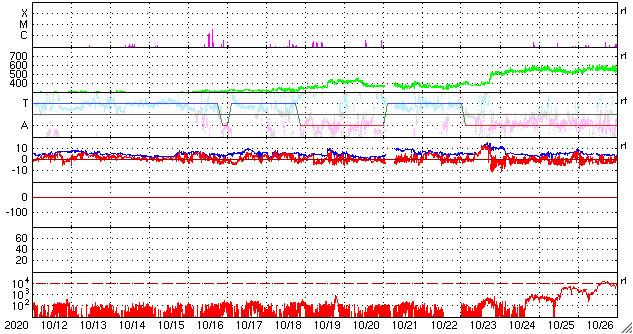 2020/11/11 13:39 太陽風は更に低速になっています。10月の黒点相対数は 14.4 でした。