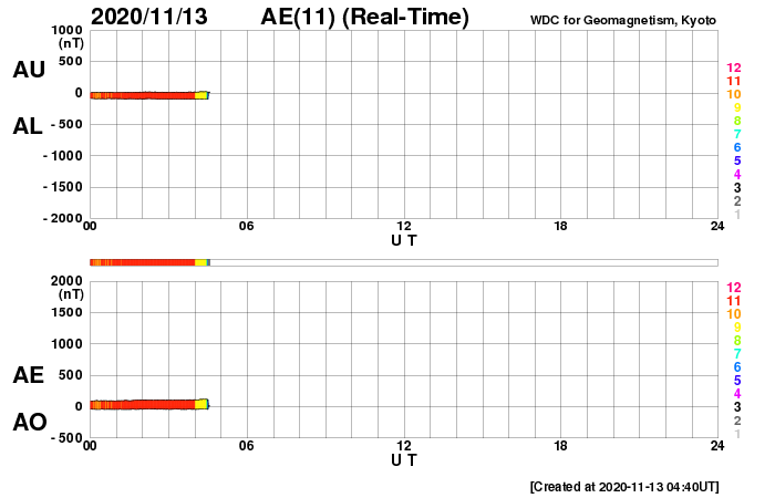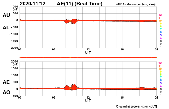 下段のAEグラフの値が高くなると、オーロラ活動が活発化しています。