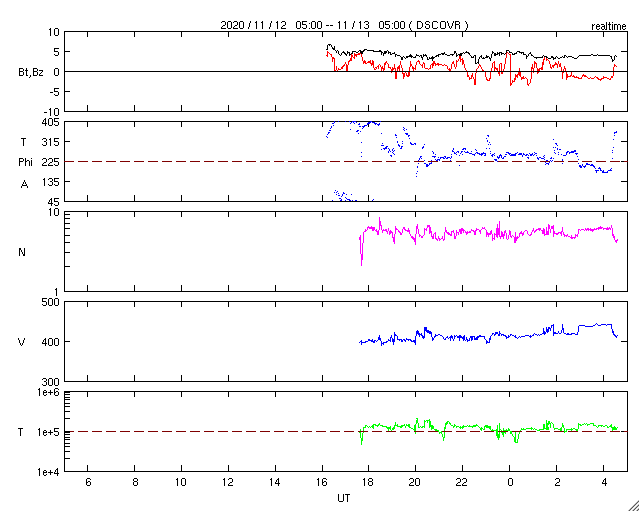 太陽風は速度、南向き磁場ともに静かです。