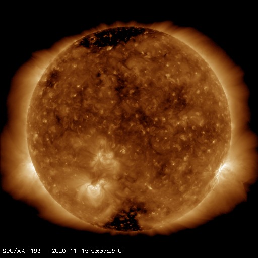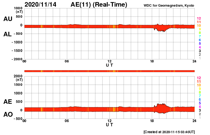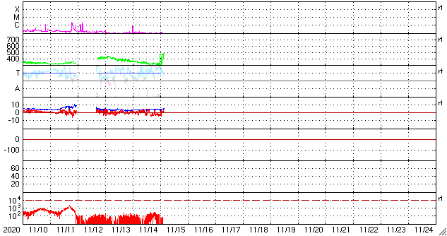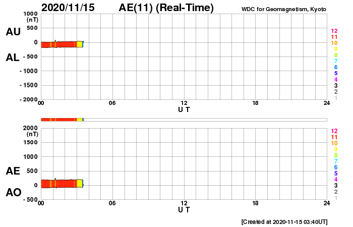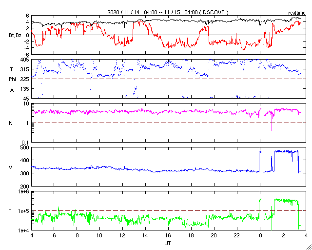 2020/11/15 12:52 更新 太陽風は更に低速になっています。太陽は無黒点になるかもしれません。 担当 篠原 太陽風の速度は350km/秒から310km/秒へ下がり、 更に低速になっています。 掲載のグラフの最後で、 速度が450km/秒に急に高まっていますが、 これはデータエラーだと思います。 磁場強度は4~5nTと平均的です。 南北成分は、グラフの途中から弱い南向きの変化が発生しています。 しかし、速度がだいぶ下がっているので磁気圏は穏やかで、 AE指数は目立つほどの変化は発生していません。 SDO衛星AIA193は、北極と南極にコロナホールが見えていますが、 低緯度域はぼんやりと光っているだけです。 太陽風は穏やかな状態が続きそうです。 太陽は、2781黒点群が西の端に沈みかけています。 もうひとつの2782群は黒点が見えなくなっていて、 太陽は無黒点になるかもしれません。 SDO衛星AIA193では、南東の端(左下)が明るく光っていて、 向こう側から活動的な領域が近づいている様です。 ここに黒点はあるでしょうか。 SDO衛星AIA193などの動画を見ると、 特に活発な領域ではないようです。 ![]() SDO衛星のAIA193カメラによる太陽コロナの様子 (c) SDO (NASA) ![]() SDO衛星による太陽の可視光写真。マウスの矢印を写真に重ねると、黒点番号付きの写真に切り替わります。 (c) SDO (NASA) ![]() DSCOVRが観測した太陽風の磁場(1番上の枠、黒線は全体の強度、赤線は南北成分) および、太陽風の密度(3番目の紫線)、速度(4番目の青線) (c) データ:NOAA/SWPC、作図:宇宙天気ニュース ![]() AE指数(速報値) 下段のAEグラフの値が高くなると、オーロラ活動が活発化しています。 (c) 京都大学WDC ![]() ![]() 27日の太陽周期に合わせたデータプロット 太陽が同じ面を地球に向けていた27日前の変化から、今後を予想することができます。 (c) 作図:宇宙天気ニュース