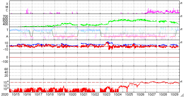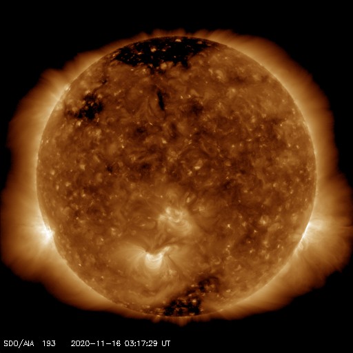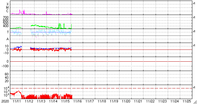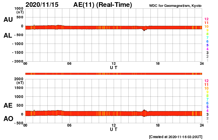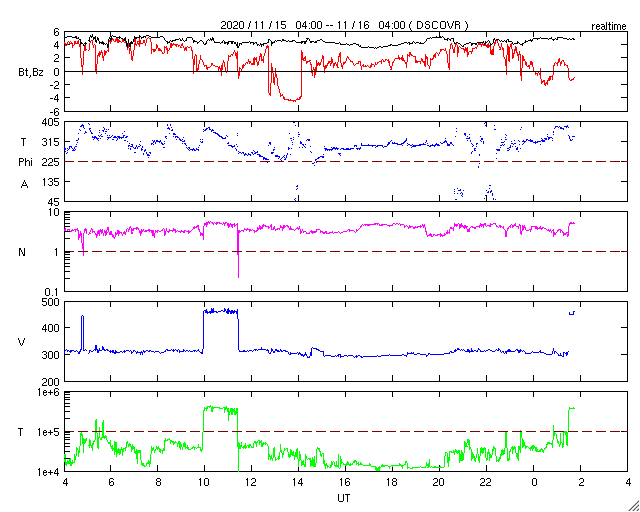 2020/11/16 12:36 更新 300km/秒の低速の太陽風が続いています。太陽は無黒点です。 担当 篠原 太陽風は、300km/秒の低速の風が続いています。 磁場強度は、5nTと平均的です。 磁場の南北成分は、北寄りの傾向になっています。 速度が下がっていることもあり、磁気圏は穏やかで、 AE指数はほとんど変化がありません。 SDO衛星AIA193では、 太陽の北東側(左上)に小さいコロナホールが見えています。 27日前の前周期には、この辺りに広いコロナホールが見えていたのですが、 現在は広がりが変化している様です。 27日周期の図の前周期の10月23日に始まる高速太陽風は、 今回はどの様になるでしょうか。 太陽は、2781黒点群が西に沈み、無黒点になっています。 SDO衛星AIA193では、南東の端(左下)から明るい領域が現れていますが、 今のところ黒点は見えない様です。