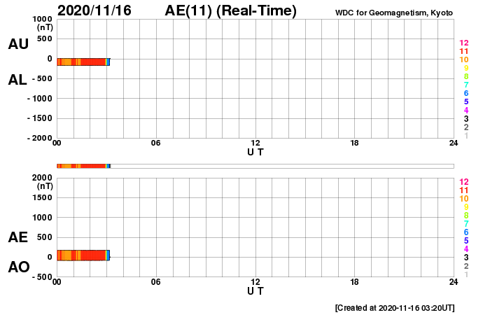 (c) SDO (NASA) ![]() SDO衛星による太陽の可視光写真 (c) SDO (NASA) ![]() DSCOVRが観測した太陽風の磁場(1番上の枠、黒線は全体の強度、赤線は南北成分) および、太陽風の密度(3番目の紫線)、速度(4番目の青線) (c) データ:NOAA/SWPC、作図:宇宙天気ニュース ![]() AE指数(速報値) 下段のAEグラフの値が高くなると、オーロラ活動が活発化しています。 (c) 京都大学WDC ![]() ![]() 27日の太陽周期に合わせたデータプロット 太陽が同じ面を地球に向けていた27日前の変化から、今後を予想することができます。 (c) 作図:宇宙天気ニュース