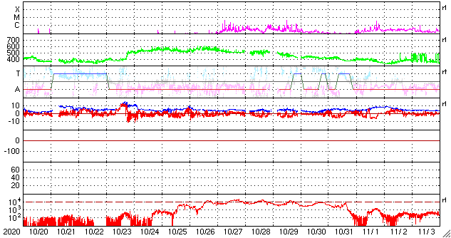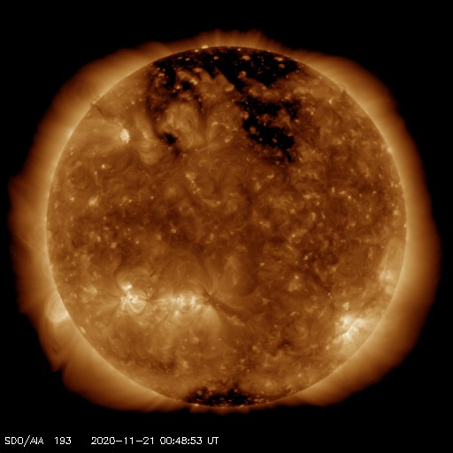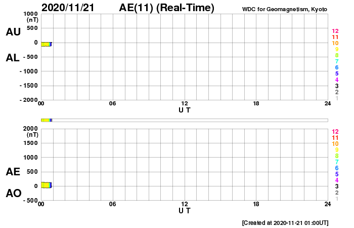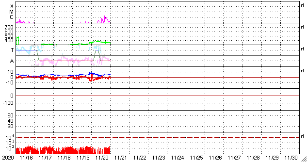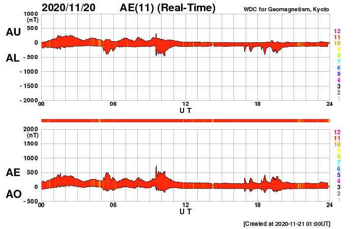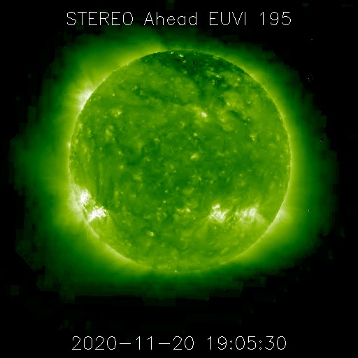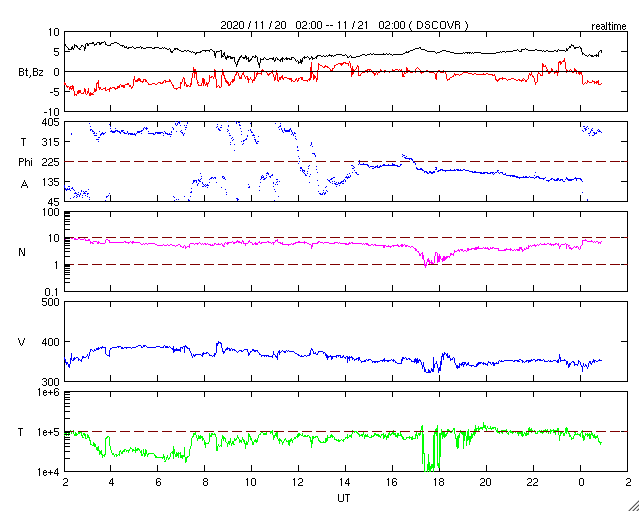 2020/11/21 10:04 更新 太陽風は低速に戻っています。太陽の東端の向こう側でフレアが発生しています。 担当 篠原 380km/秒に少し上昇していた太陽風の速度は、 昨夕くらいから低下に向かい、 現在は350km/秒と低速の状態に戻っています。 27日周期の図の前周期の太陽風速度の高まりは、 今のところ完全に消えています。 磁場強度は5nTと平均的です。 南北成分は、弱い南寄りから0nT付近で小さく変化する様に変わり、 AE指数のグラフは、前半は小規模の変化が見えていますが、 次第に変化が少なくなっています。 現在の磁気圏は穏やかです。 SDO衛星AIA193では、北半球のコロナホールが西に進んでいます。 明日くらいから影響が始まるかもしれません。 緯度が高めなので、どの程度の変化になるか注目してください。 太陽では、北東(左上)に小さい黒点が現れています。 昨日見えていた南東の小さい黒点は消えています。 X線グラフは、B〜Cクラスの小さいフレアが連続しています。 一番高く尖った変化になっているC1.9の小規模フレアは、 南東(左下)の2783黒点群で発生しています。 その他の、B6.4、C1.0などのゆっくりした変化のフレアは、 太陽の東端の向こう側にある活動領域で発生したものです。 フレアの発生地点は見えていないので、 その上空の変化を捉えたものです。 図の1枚目にSTEREO Ahead衛星EUVI 195の写真を掲載します。 この写真の左側の3分の1程度が地球から見えない領域です。 この写真の左下に明るい領域が2か所見えています。 ここで活発にフレアが発生しています。 明日くらいからSDO衛星でも見える様になりそうです。 注目してください。