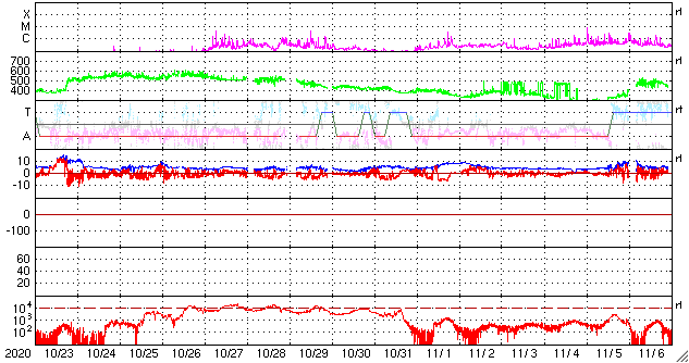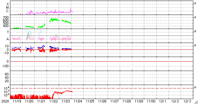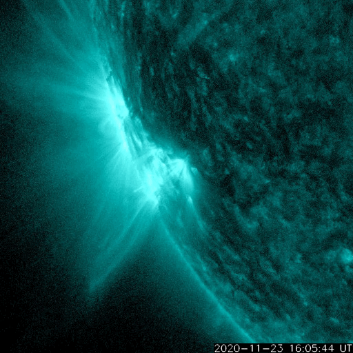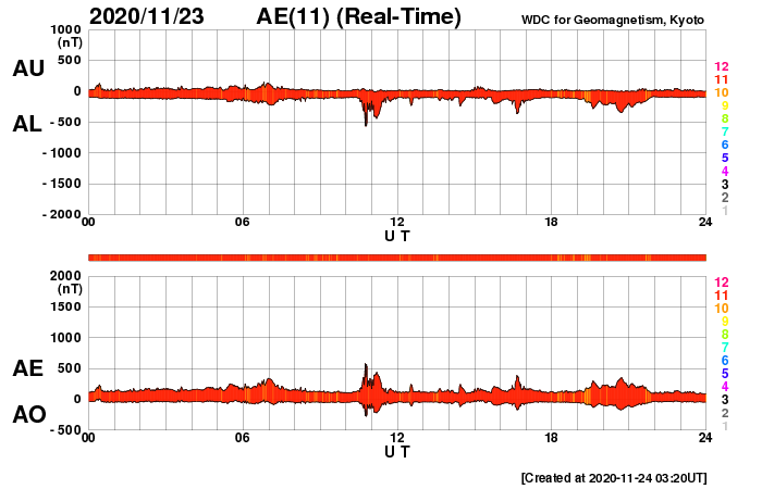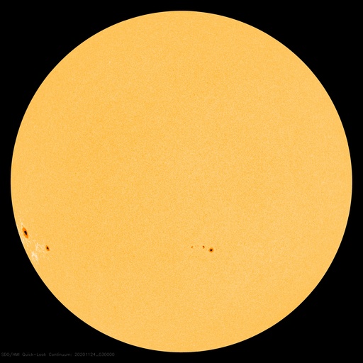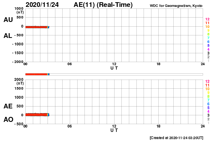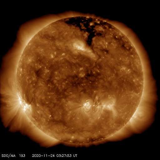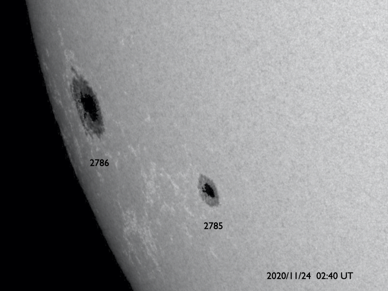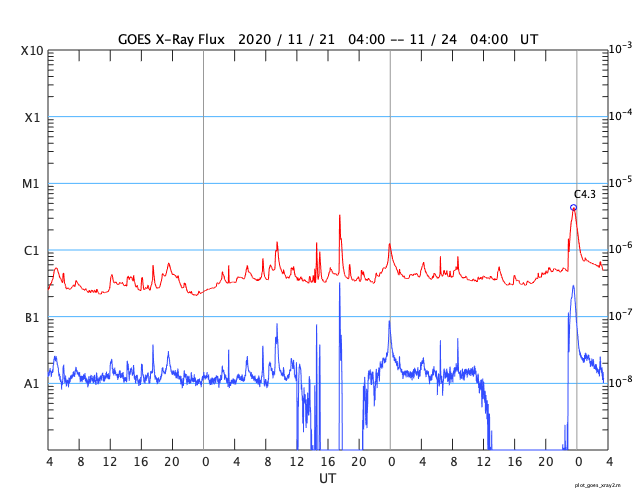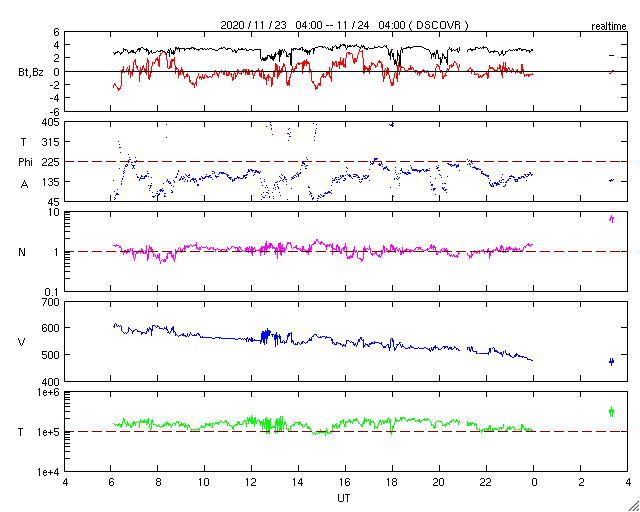 2020/11/24 12:39 更新 C4.3の小規模フレアが発生しました。新しい黒点が東端から現れています。 担当 篠原 今朝、24日8時(世界時23日23時)に 太陽の南東(左下)の2785黒点群で、 C4.3の小規模フレアが発生しました。 SDO衛星AIA131による動画を掲載します。 また、2785群の向こうから、 大きい黒点がこちら側に回ってきました。 2786群と番号が付けられています。 2枚目に可視光の拡大写真を掲載しています。 2785群の2倍くらいの大きさに見えます。 今後どのような活動を起こすでしょうか。 太陽風は、昨日のニュース以降も速度の低下が続き、 現在は480km/秒とやや高速程度です。 今回の高速太陽風は2日程度で終わりを迎えるかもしれません。 太陽風の磁場強度は、3nTとやや弱い状態です。 南北成分は、0nT付近で小さく変化する様になり、 磁気圏の変化は規模が小さくなっています。 AE指数は、200~300nTの小規模の変化が発生する程度です。 SDO衛星AIA193は、低緯度域にコロナホールは見られず、 太陽風は穏やかな状態になりそうです。 ![]() 2785黒点群で発生したC4.3の小規模フレア。SDO衛星AIA131。 (c) SDO (NASA)、(動画加工 : 宇宙天気ニュース) ![]() 2785黒点群(右)と新しく現れた2786群(左)。SDO衛星。 (c) SDO (NASA)、作図:宇宙天気ニュース ![]() SDO衛星のAIA193カメラによる太陽コロナの様子 (c) SDO (NASA) ![]() SDO衛星による太陽の可視光写真。マウスの矢印を写真に重ねると、黒点番号付きの写真に切り替わります。 (c) SDO (NASA) ![]() GOES衛星の太陽X線強度。赤・橙 = 0.1〜0.8 nm、青・紫 = 0.05〜0.4 nm (c) データ:NOAA/SWPC、作図:宇宙天気ニュース ![]() DSCOVRが観測した太陽風の磁場(1番上の枠、黒線は全体の強度、赤線は南北成分) および、太陽風の密度(3番目の紫線)、速度(4番目の青線) (c) データ:NOAA/SWPC、作図:宇宙天気ニュース ![]() AE指数(速報値) 下段のAEグラフの値が高くなると、オーロラ活動が活発化しています。 (c) 京都大学WDC ![]() ![]() 27日の太陽周期に合わせたデータプロット 太陽が同じ面を地球に向けていた27日前の変化から、今後を予想することができます。 (c) 作図:宇宙天気ニュース