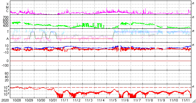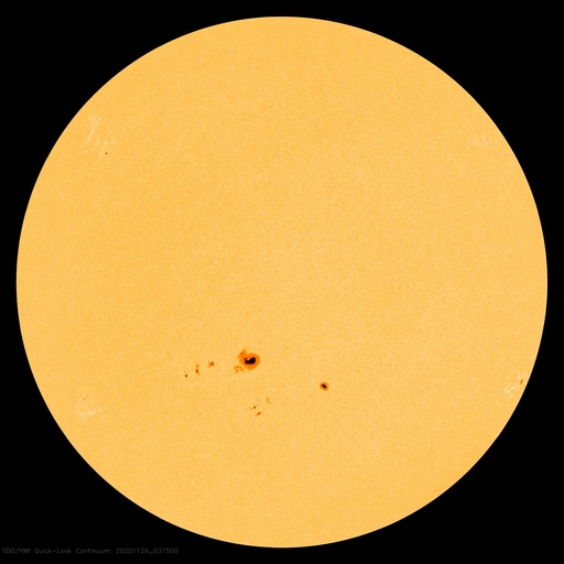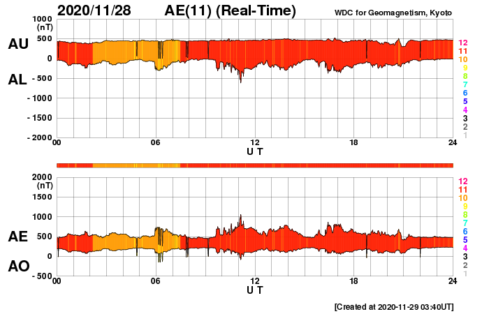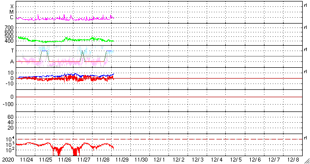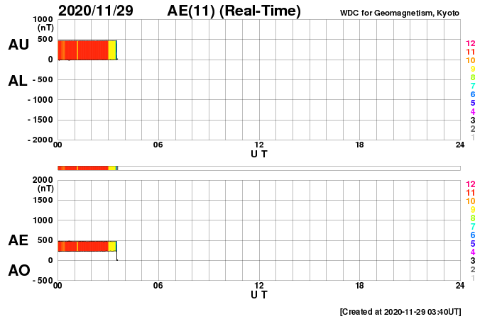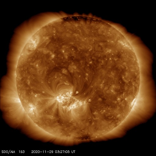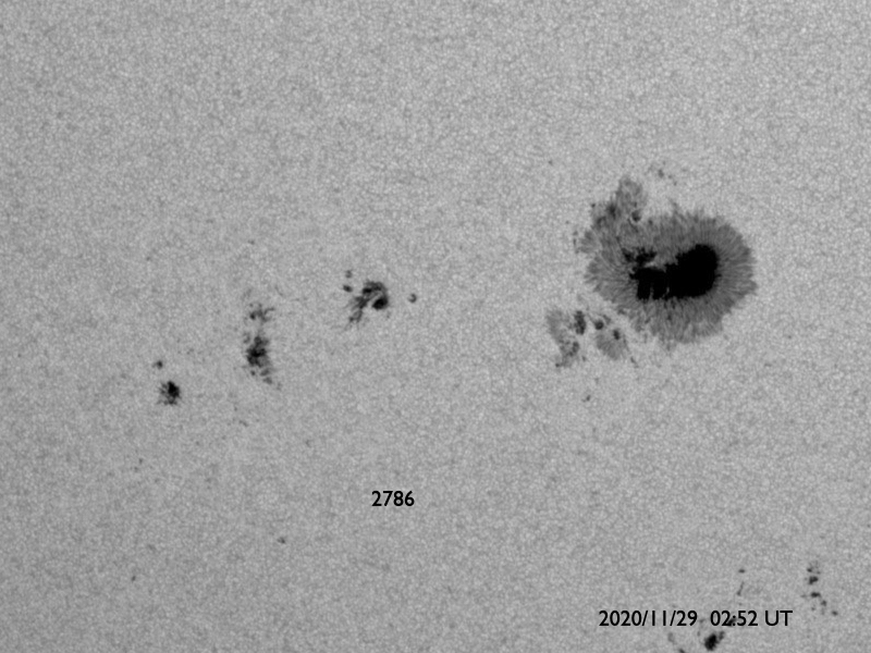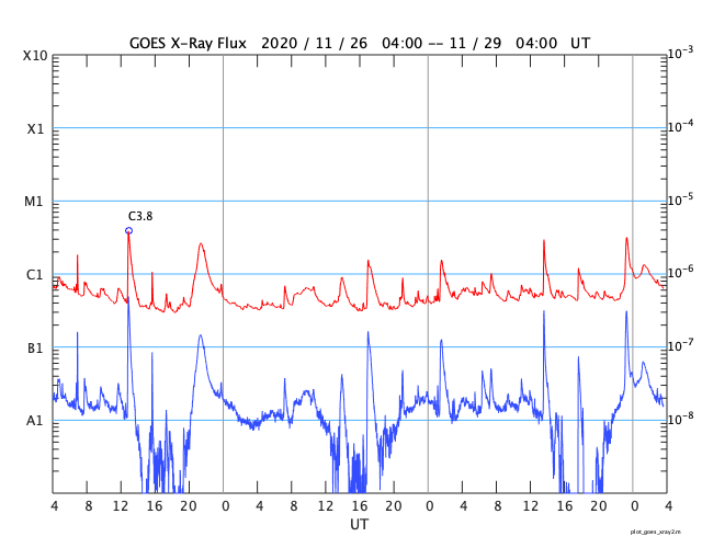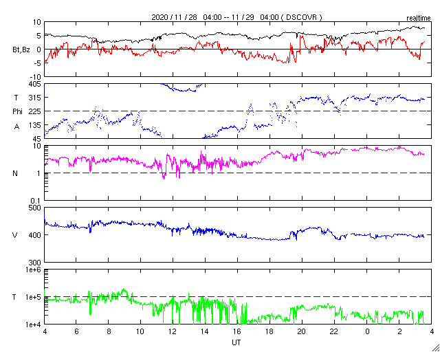 2020/11/29 12:42 更新 Cクラスのフレアが続いています。太陽の南東に新しい黒点が現れています。 担当 篠原 太陽の中央部で大きな姿を見せている2786黒点群では、 C2.9、C1.2の小規模フレアや、 Bクラスの小さいフレアの発生が続いています。 黒点の見え方としては、 左側の小さい黒点が昨日よりも増えています。 そして、太陽の南東(左下)の領域に小さい黒点が出現しています。 番号はまだ付けられていませんが、 これで太陽全体で5つの黒点群が見えていることになります。 太陽風の速度は、450km/秒から400km/秒へ少し下がり、 平均的な状態です。 磁場強度は、5nTから8nTに少し上がっています。 磁場の南北成分は、南を向いたり、北を向いたりしています。 磁気圏では小規模の活動が起きていて、 AE指数は見にくい状態が続いていますが、 300〜500nT程度の変化が起きている様です。 SDO衛星AIA193では、太陽全体がぼんやりと光っています。 太陽風は基本的には穏やかに推移しそうです。 ![]() 2786黒点群の拡大写真。SDO衛星。 (c) SDO (NASA)、作図:宇宙天気ニュース ![]() SDO衛星のAIA193カメラによる太陽コロナの様子 (c) SDO (NASA) ![]() SDO衛星による太陽の可視光写真。マウスの矢印を写真に重ねると、黒点番号付きの写真に切り替わります。 (c) SDO (NASA) ![]() GOES衛星の太陽X線強度。赤・橙 = 0.1〜0.8 nm、青・紫 = 0.05〜0.4 nm (c) データ:NOAA/SWPC、作図:宇宙天気ニュース ![]() DSCOVRが観測した太陽風の磁場(1番上の枠、黒線は全体の強度、赤線は南北成分) および、太陽風の密度(3番目の紫線)、速度(4番目の青線) (c) データ:NOAA/SWPC、作図:宇宙天気ニュース ![]() AE指数(速報値) 下段のAEグラフの値が高くなると、オーロラ活動が活発化しています。 (c) 京都大学WDC ![]() ![]() 27日の太陽周期に合わせたデータプロット 太陽が同じ面を地球に向けていた27日前の変化から、今後を予想することができます。 (c) 作図:宇宙天気ニュース