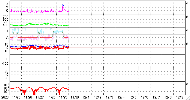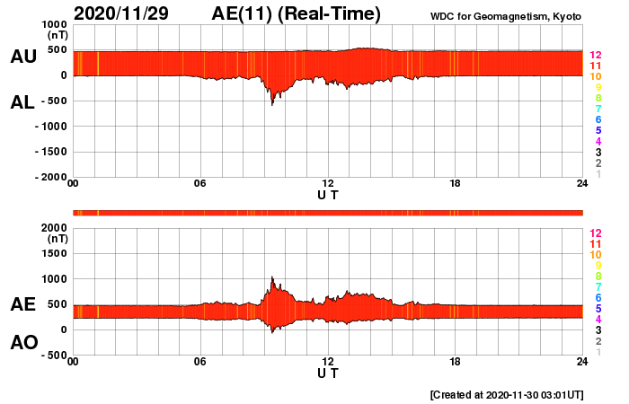下段のAEグラフの値が高くなると、オーロラ活動が活発化しています。