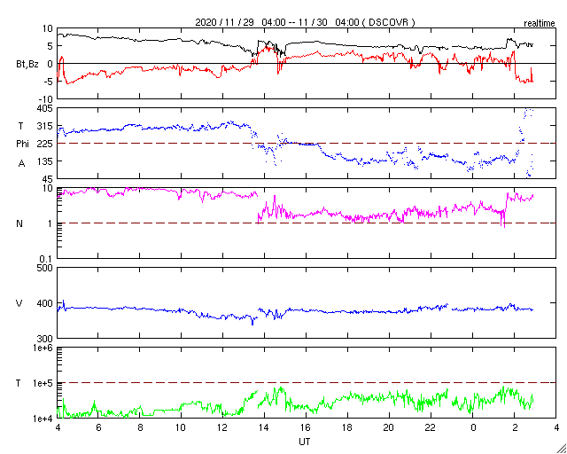 2020/11/26 13:46 太陽風はやや低速になっています。太陽はやや落ち着いています。