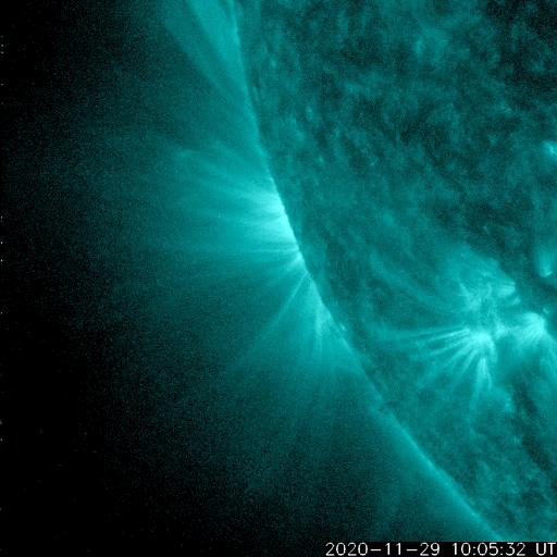 2020/11/27 14:11 太陽の北東の端から黒点が現れ、C2.7の小規模フレアを起こしています。