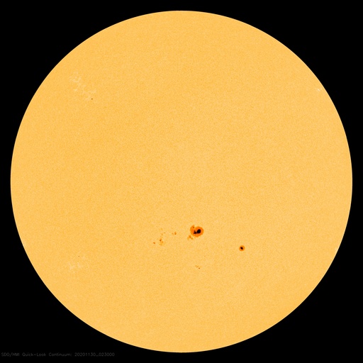 SDO衛星による太陽の可視光写真。マウスの矢印を写真に重ねると、黒点番号付きの写真に切り替わります。