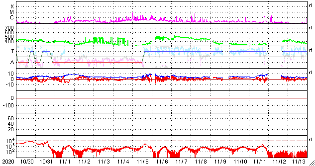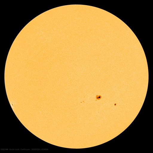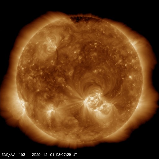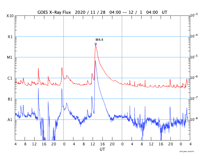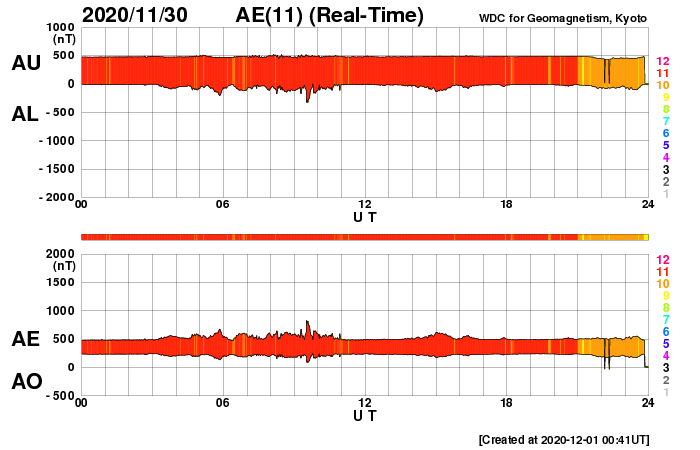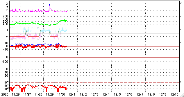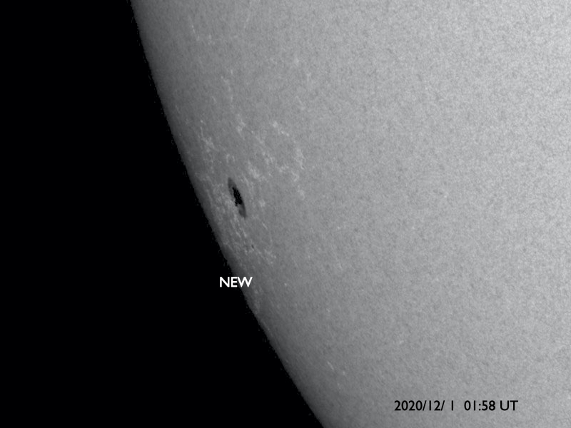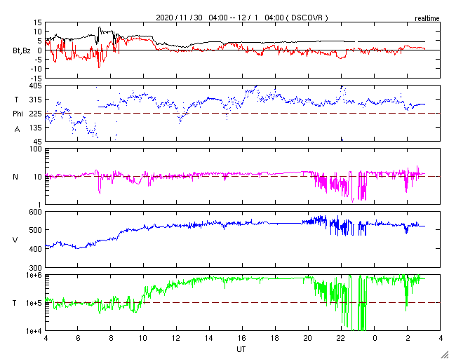 2020/12/ 1 12:20 更新 太陽の南東から新しい黒点が現れました。太陽風は530km/秒の高速風になっています。 担当 篠原 太陽の南東の端(左下)から、 M4.4のフレアを起こした領域が姿を現しました。 可視光の拡大写真を掲載します。 今のところ大きめの黒点がぽつんと見えています。 活動も落ち着いている様で、 Bクラスの小さいフレアが観測されている程度です。 引き続き注目してください。 一方、北東(左上)の2787群と南東(左下)2789群は、 黒点が見えなくなっています。 そして、中央部南側の2786群、2788群は 黒点が小さくなっています。 太陽風は、昨日の午後から速度が高まり始め、 30日18時(世界時30日9時)には500km/秒に達して、 高速風になりました。 その後も530km/秒前後で推移しています。 磁場強度は、速度が高まる頃に10nTに強まっていますが、 その後は4nTと平均的な状態に戻っています。 SDO衛星AIA193では、 コロナホールは特に見られなかったのですが、 どこかに噴き出し口があった様です。 磁場の南北成分は、0nT付近で小さく変化しています。 磁気圏は基本的には穏やかの様で、 AE指数は小さい変化が起きている程度です。 高速太陽風はこれからどの様に推移するでしょうか。 注目してください。