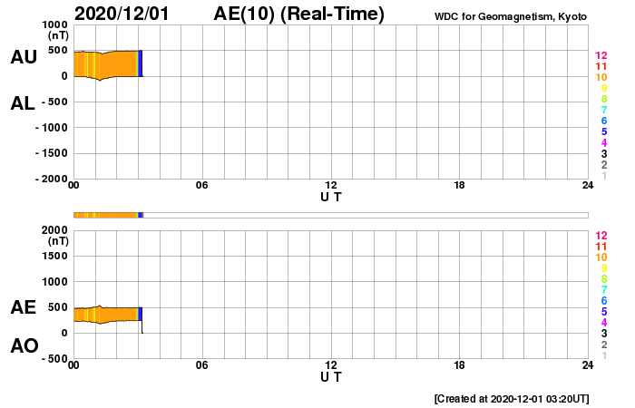 (c) SDO (NASA)、作図:宇宙天気ニュース ![]() SDO衛星のAIA193カメラによる太陽コロナの様子 (c) SDO (NASA) ![]() SDO衛星による太陽の可視光写真。マウスの矢印を写真に重ねると、黒点番号付きの写真に切り替わります。 (c) SDO (NASA) ![]() GOES衛星の太陽X線強度。赤・橙 = 0.1〜0.8 nm、青・紫 = 0.05〜0.4 nm (c) データ:NOAA/SWPC、作図:宇宙天気ニュース ![]() DSCOVRが観測した太陽風の磁場(1番上の枠、黒線は全体の強度、赤線は南北成分) および、太陽風の密度(3番目の紫線)、速度(4番目の青線) (c) データ:NOAA/SWPC、作図:宇宙天気ニュース ![]() AE指数(速報値) 下段のAEグラフの値が高くなると、オーロラ活動が活発化しています。 (c) 京都大学WDC ![]() ![]() 27日の太陽周期に合わせたデータプロット 太陽が同じ面を地球に向けていた27日前の変化から、今後を予想することができます。 (c) 作図:宇宙天気ニュース
