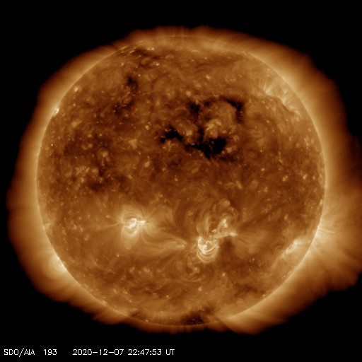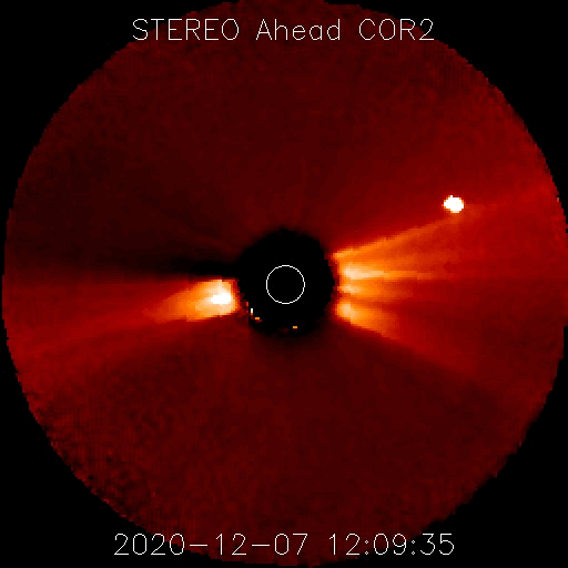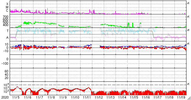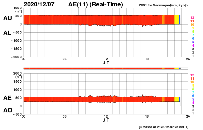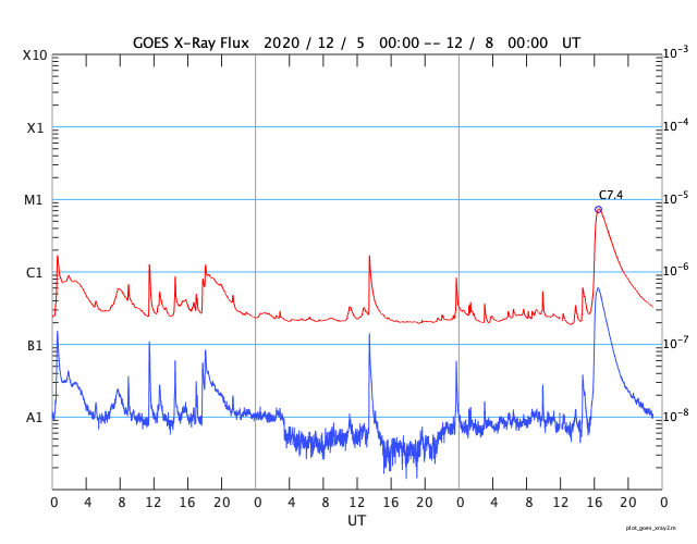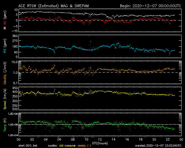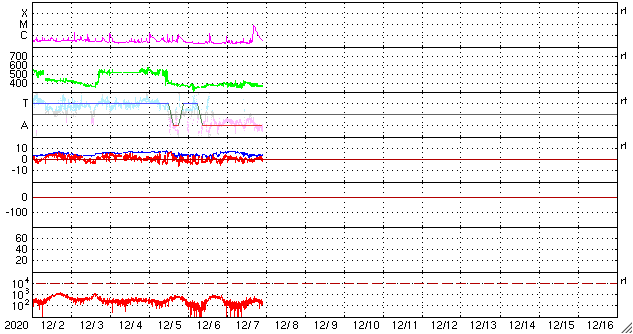 2020/12/ 8 08:02 更新 C7.4の小規模フレアが発生しました。CMEの乱れが地球に到来しそうです。 担当 篠原 今日の未明、8日1時(世界時7日16時)に、 太陽の中央部の2790黒点群で、 C7.4の小規模フレアが発生しました。 SDO衛星AIA131による動画を掲載します。 太陽を左側から観測しているSTEREO Ahead衛星の COR2カメラによると、 このフレアに伴ってCME(コロナ質量放出)が発生しています。 動画では、地球のある右側に向かってガスが飛び出しています。 3〜4日程度で乱れが地球に到来すると考えると、 11〜12日頃に太陽風の速度の高まりや磁場の強まりが 始まる可能性があります。 南向きに磁場が強まる変化が到来すると、 磁気圏の活動は一気に強まります。 今後の推移に注目してください。 太陽風は、速度が360km/秒に下がり低速になっています。 磁場強度も、6nTから4nTに下がっています。 磁場の南北成分は、0nT付近で小さく変化しています。 磁気圏は概ね静穏の様です。