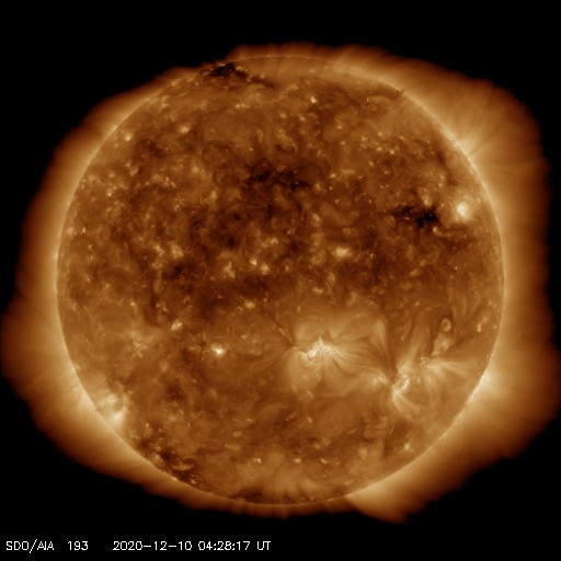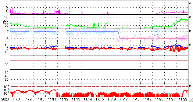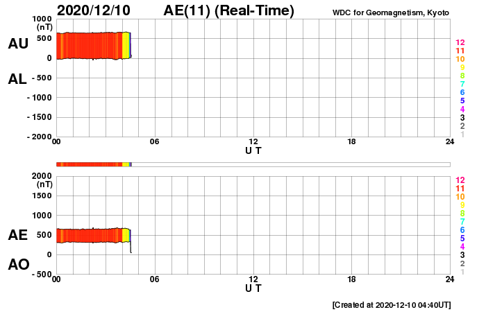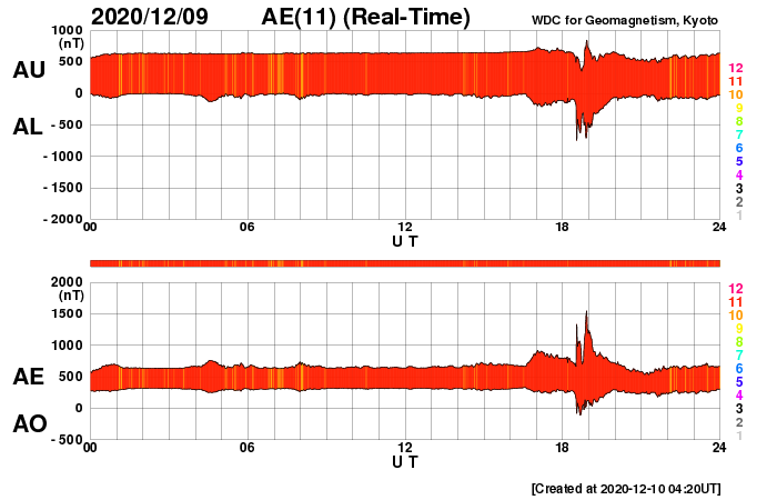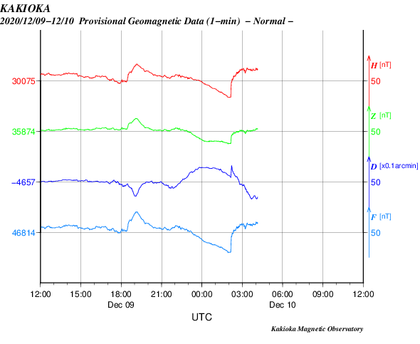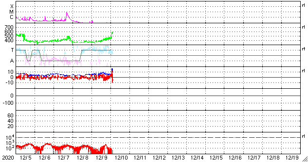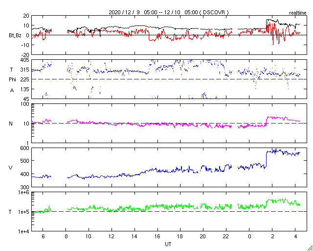 2020/12/10 13:31 更新 8日のCMEによる太陽風の乱れが到来しました。 担当 篠原 今日の昼前、10日10時半(世界時10日1時半)に、 8日未明に発生したCMEによる太陽風の乱れが到来しました。 太陽風の速度は、570km/秒に高まり、 磁場強度も15nTに強まっています。 フレアの発生から2日半ほどで地球にやって来たことになります。 1枚目に地磁気観測所の磁場データを掲載しています。 この図では、10日11時(世界時10日2時)を少し過ぎた頃に 磁場の急な変化が発生しています。 太陽風の急な強まりを受けて、 地球の磁気圏が押しつぶされた反応です。 (太陽風のグラフとの時差は、 人工衛星から地球まで150万kmを通過する時間です) 太陽風磁場の南北成分は、南北に細かく変化していますが、 全体としては北寄りになっている様です。 このためか、磁気圏の乱れはここまでは目立つ程ではありません。 AE指数はデータが太くなっているだけです。 現在の太陽風は、速度は550km/秒、磁場強度は10nTと、 どちらも高まっていますが、最初の頃からは少し下がっています。 この後、磁場がどのくらい南向きに振れるかで、 磁気圏の変化の様子が変わります。 引き続き注目してください。 太陽は、北西(右上)に小さい黒点が現れています。 X線グラフに目立つ程の変化はなく、 太陽は穏やかです。 ![]() 茨城県石岡市柿岡の地磁気観測所で測定された地磁気の変化。10日11時(世界時10日2時)に急な変化が発生している。 (c) 地磁気観測所 ![]() SDO衛星のAIA193カメラによる太陽コロナの様子 (c) SDO (NASA) ![]() SDO衛星による太陽の可視光写真。マウスの矢印を写真に重ねると、黒点番号付きの写真に切り替わります。 (c) SDO (NASA) ![]() DSCOVRが観測した太陽風の磁場(1番上の枠、黒線は全体の強度、赤線は南北成分) および、太陽風の密度(3番目の紫線)、速度(4番目の青線) (c) データ:NOAA/SWPC、作図:宇宙天気ニュース ![]() AE指数(速報値) 下段のAEグラフの値が高くなると、オーロラ活動が活発化しています。 (c) 京都大学WDC ![]() ![]() 27日の太陽周期に合わせたデータプロット 太陽が同じ面を地球に向けていた27日前の変化から、今後を予想することができます。 (c) 作図:宇宙天気ニュース