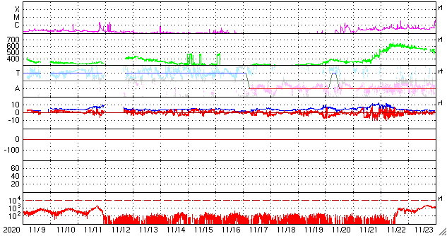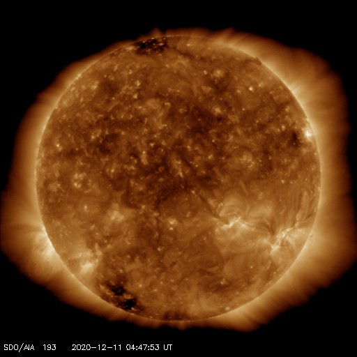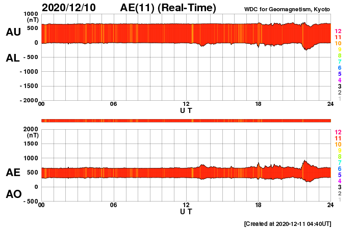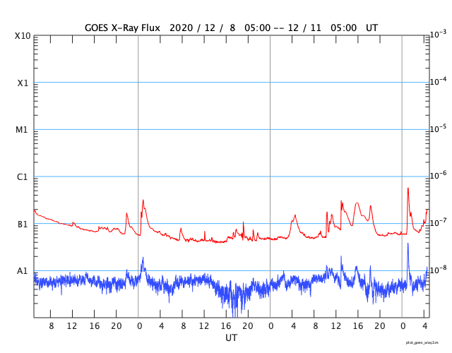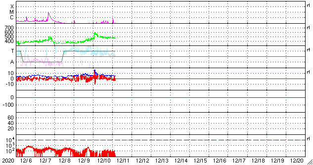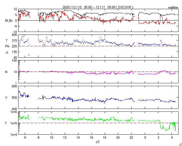 2020/12/11 13:54 更新 太陽風の乱れは終わりかけています。磁気圏は穏やかです。 担当 篠原 太陽風の速度は、550km/秒から460km/秒へ下がり やや高速程度になっています。 磁場強度も、5nTと平均的な値に戻っています。 太陽風の乱れは、1〜2日程度で終わりそうです。 磁場の南北成分は、グラフの中盤までは北寄りで、 その後、弱い南寄りになっています。 磁気圏の活動は特に高まることはなく、 AE指数は小さい変化が見られる程度です。 SDO衛星AIA193では、 太陽の低緯度域にコロナホールはありません。 この後の太陽風は穏やかになりそうです。 太陽は、昨日見えていた北西(右上)の小さい黒点はすぐに消えて、 南西(右下)の2790群だけになっています。 X線グラフでは、Bクラスの小さいフレアが続いていますが、 これらは2790群の左側にあった2791群の領域で起きています。 SDO衛星AIA193の写真で明るく光っている領域です。
