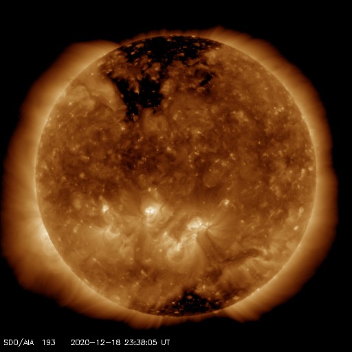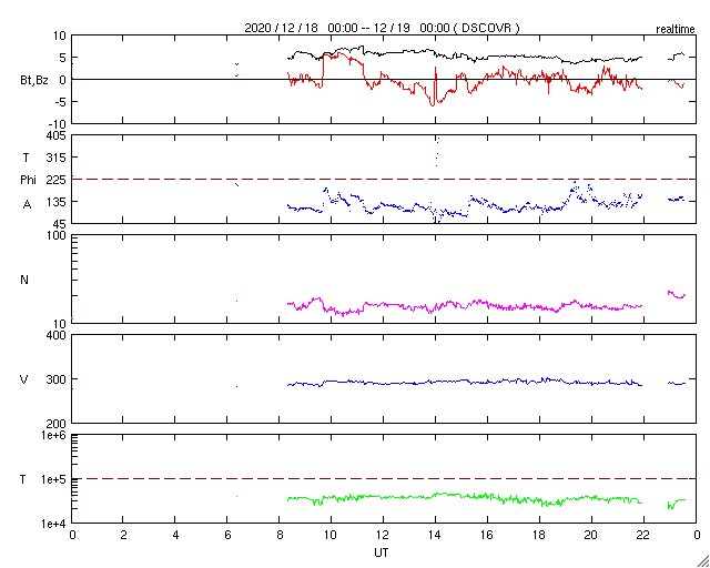 2020/12/19 08:48 更新 低速の太陽風が続いています。太陽は無黒点寸前です。 担当 篠原 太陽風は、290km/秒と低速の状態が続いています。 速度が300km/秒台を割って3日半になりました。 27日周期の図では、速度の緑色の線が見えない状態が続いています。 磁場強度は、5nTと平均的な状態です。 南北成分は南北に変化していて、 AE指数には小規模の活動が起きていますが、 全体としては磁気圏は穏やかです。 SDO衛星AIA193では、 北半球の中緯度にコロナホールが見えています。 もうすぐ太陽の中央線に達するくらいなので、 4日後くらいから地球に影響がやって来るかもしれません。 緯度が高めなので、どの程度の影響が見られるでしょうか。 太陽は、2793黒点群が更に小さくなり、 SDO衛星の拡大写真で黒い点が微かに見えるくらいです。 (掲載の写真では全く見えません) 一方、東端の向こう側から新しい領域が近付いていて、 SDO衛星AIA193でも少し明るく見える様になっています。 この後、どの様な領域が現れるでしょうか。 ![]() SDO衛星のAIA193カメラによる太陽コロナの様子 (c) SDO (NASA) ![]() SDO衛星による太陽の可視光写真。マウスの矢印を写真に重ねると、黒点番号付きの写真に切り替わります。 (c) SDO (NASA) ![]() DSCOVRが観測した太陽風の磁場(1番上の枠、黒線は全体の強度、赤線は南北成分) および、太陽風の密度(3番目の紫線)、速度(4番目の青線) (c) データ:NOAA/SWPC、作図:宇宙天気ニュース ![]() AE指数(速報値) 下段のAEグラフの値が高くなると、オーロラ活動が活発化しています。 (c) 京都大学WDC ![]() 27日の太陽周期に合わせたデータプロット 太陽が同じ面を地球に向けていた27日前の変化から、今後を予想することができます。 (c) 作図:宇宙天気ニュース