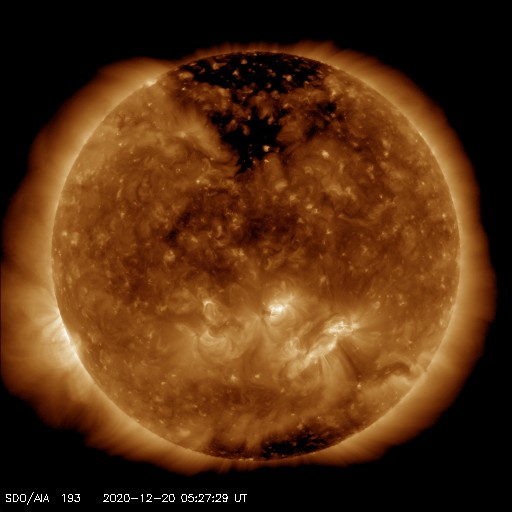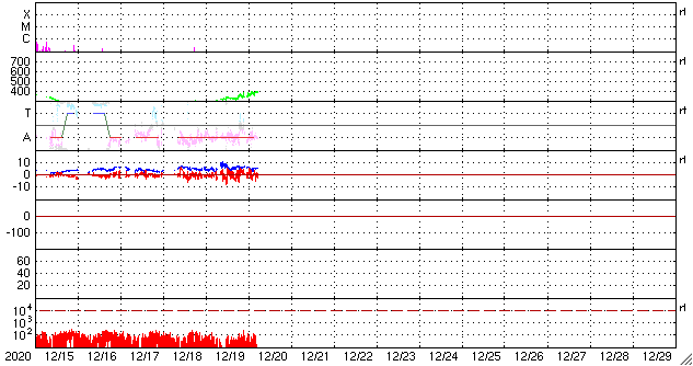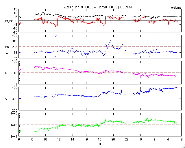 2020/12/20 14:31 更新 太陽風は平均的な速度にもどっています。太陽は無黒点です。 担当 篠原 太陽風の速度は、昨夕に 300km/秒台に少し上がり、 今日の未明から上昇を始めて、 400km/秒と平均的な状態に戻ったところです。 磁場強度は、昨夕に一時的に10nT近くに上がっていますが、 その他は5nT前後で推移しています。 現在、AE指数を参照することができませんが、 磁気圏は、基本的には穏やかに推移している様です。 SDO衛星AIA193では、 中央部の北半球側にコロナホールが見えています。 2〜3日後くらいから影響が地球に到来する可能性があります。 27日前より広がりが大きくなっているので、注目してください。 太陽は無黒点になっています。 STEREO Ahead衛星によると、 南東の端から活動的な領域が近づいていて、 これから見える様になりそうです。 ただし、SDO衛星AIA193では特に活動の様子は見えないので、 活動度は低い領域かもしれません。 ![]() SDO衛星のAIA193カメラによる太陽コロナの様子 (c) SDO (NASA) ![]() SDO衛星による太陽の可視光写真 (c) SDO (NASA) ![]() DSCOVRが観測した太陽風の磁場(1番上の枠、黒線は全体の強度、赤線は南北成分) および、太陽風の密度(3番目の紫線)、速度(4番目の青線) (c) データ:NOAA/SWPC、作図:宇宙天気ニュース ![]() 27日の太陽周期に合わせたデータプロット 太陽が同じ面を地球に向けていた27日前の変化から、今後を予想することができます。 (c) 作図:宇宙天気ニュース