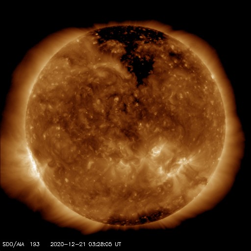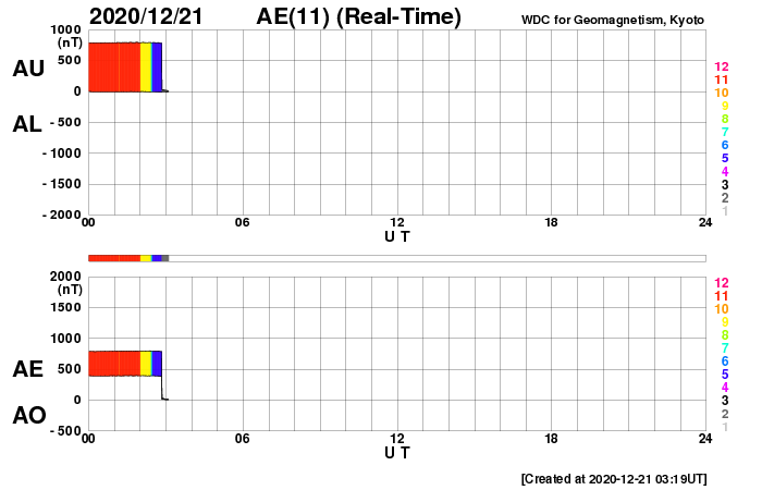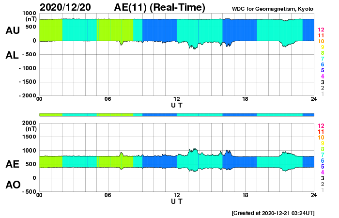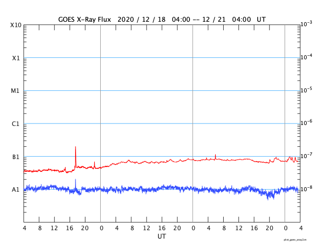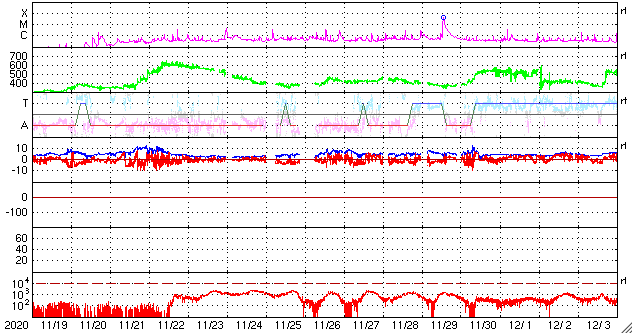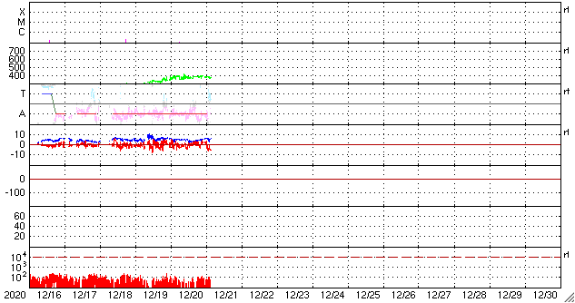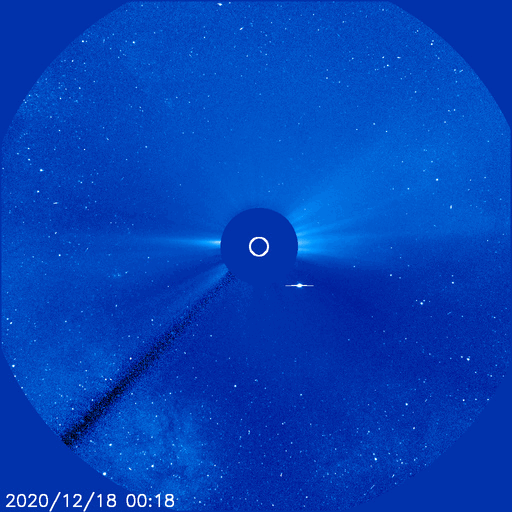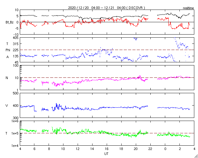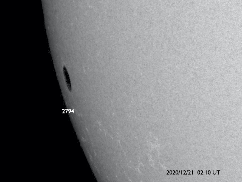 2020/12/21 12:31 更新 太陽の東端から新しい黒点が現れています。太陽風はやや低速です。 担当 篠原 太陽の南東の端から新しい黒点が現れました。 2794群と番号が付けられています。 27日前の11月24日のニュースの写真を参照すると、 ほぼ同じ位置に2786群が現れています。 2794群は、2786群が太陽の向こう側を回って、 再びこちら側に現れた黒点の様です。 X線グラフは特に変化は見られず、活動は穏やかです。 太陽風は速度が380km/秒に少し下がり、 やや低速になっています。 磁場強度は、5nTと平均的な状態で推移しています。 磁場の南北成分は、時々南向きに変化しています。 AE指数でも、小規模の変化が時々発生している様です。 全体としては、磁気圏は穏やかな状態です。 SDO衛星AIA193では、 北極域から伸びているコロナホールが、 太陽の西半球側に進んでいます。 今後、この領域の影響で太陽風の速度が高まるでしょうか。 18日からSOHO衛星LASCO C3の右上側に彗星が見えています。 動画を掲載します。