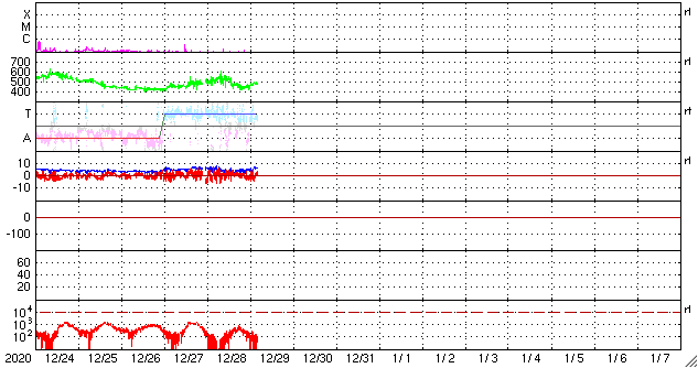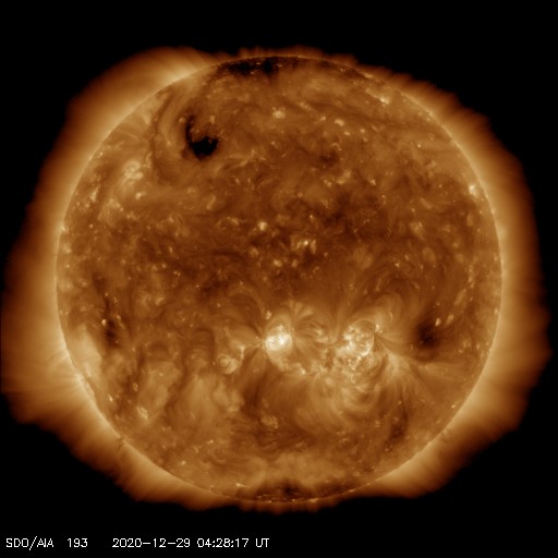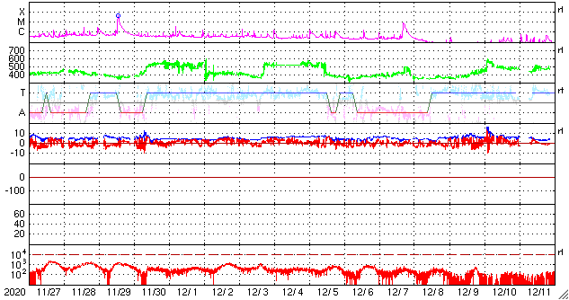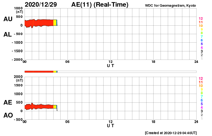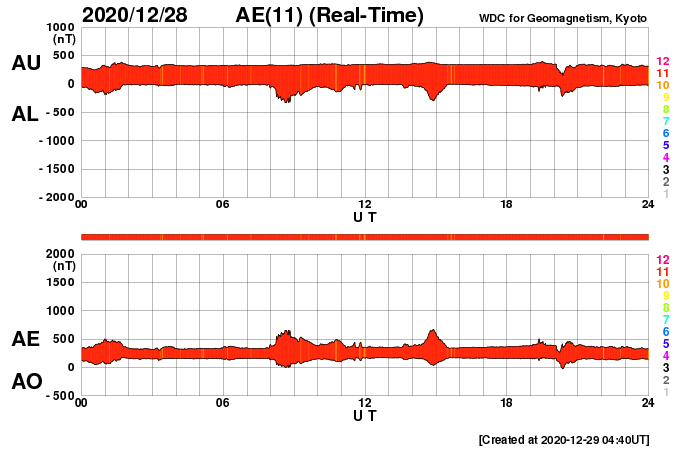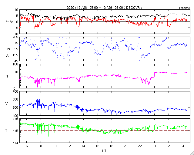 2020/12/29 13:44 更新 太陽風の速度は下がり始めています。磁気圏は穏やかです。 担当 篠原 太陽風の速度は、昨夜にかけて500km/秒台が続き、 その後一段下がって、450〜470km/秒とやや高速の状態です。 磁場強度は、5nT前後と平均的な状態です。 AE指数は、時々小規模の変化が起きている程度で、 磁気圏は概ね静穏です。 SDO衛星AIA193では、 太陽の中央部にコロナホールは見られず、 太陽風は穏やかな状態になりそうです。 太陽は、2794、2795黒点群が見えていますが、 X線グラフに特に変化はなく、 静かな状態が続いています。 ![]() SDO衛星のAIA193カメラによる太陽コロナの様子 (c) SDO (NASA) ![]() SDO衛星による太陽の可視光写真。マウスの矢印を写真に重ねると、黒点番号付きの写真に切り替わります。 (c) SDO (NASA) ![]() DSCOVRが観測した太陽風の磁場(1番上の枠、黒線は全体の強度、赤線は南北成分) および、太陽風の密度(3番目の紫線)、速度(4番目の青線) (c) データ:NOAA/SWPC、作図:宇宙天気ニュース ![]() AE指数(速報値) 下段のAEグラフの値が高くなると、オーロラ活動が活発化しています。 (c) 京都大学WDC ![]() ![]() 27日の太陽周期に合わせたデータプロット 太陽が同じ面を地球に向けていた27日前の変化から、今後を予想することができます。 (c) 作図:宇宙天気ニュース
