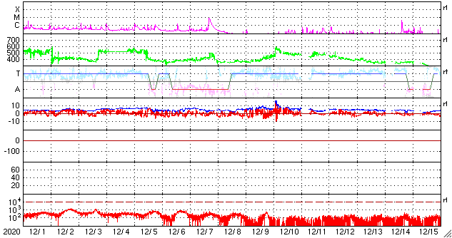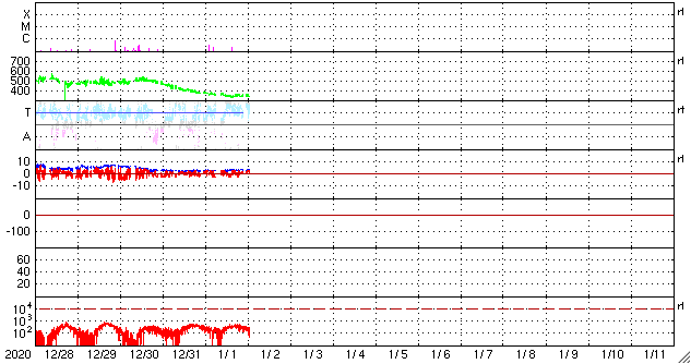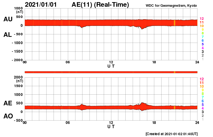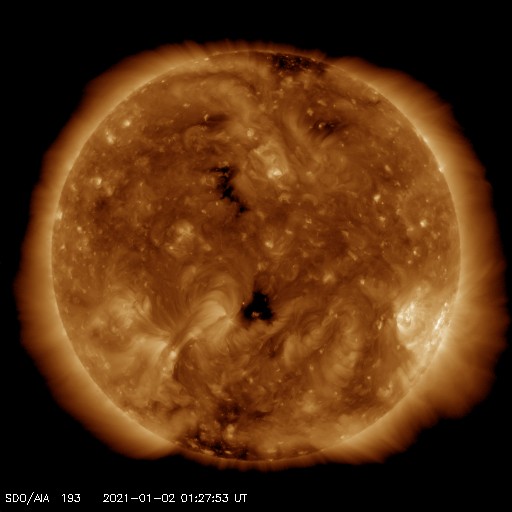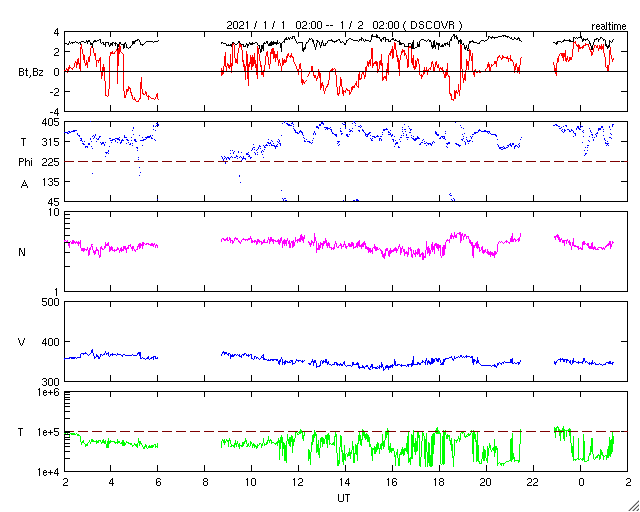 2021/ 1/ 2 10:40 更新 低速の太陽風が続いています。太陽は無黒点になるかもしれません。 担当 篠原 太陽風は、350km/秒と低速の状態で推移しています。 磁場強度は、3nTとやや弱い状態です。 磁気圏は穏やかで、 AE指数は、小さい変化が2回見られる程度です。 SDO衛星AIA193では、 小さいコロナホールが太陽の中心部の南北に見えています。 中心線付近にあるので、 速度の高い太陽風が地球の方向に噴き出しているところです。 広がりが小さいので、影響は小規模になりそうですが、 3日後くらいの太陽風に変化が見られるかもしれません。 太陽は、2795黒点群でBクラスの小さいフレアが 3回ほど発生しています。 黒点としては縮小の傾向で、 掲載の写真ではほとんど見えなくなっています。 2794群も西の端に近付いていて、 この後、太陽は無黒点になるかもしれません。