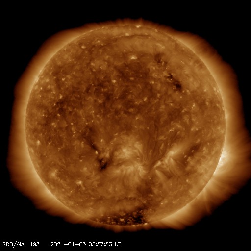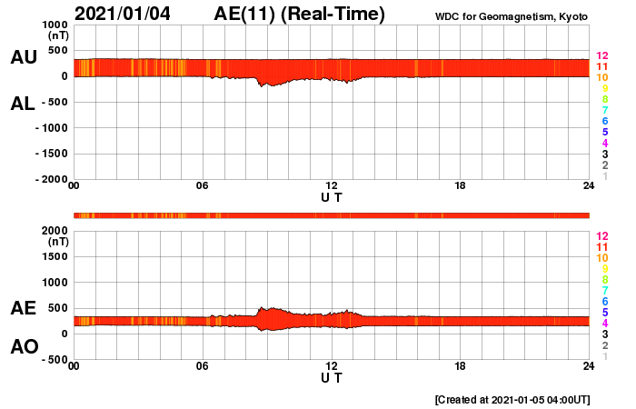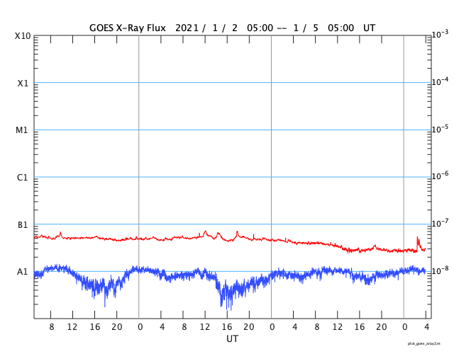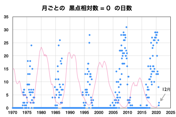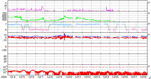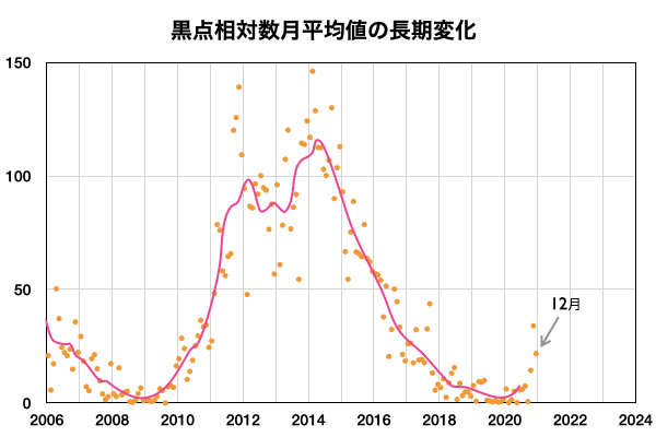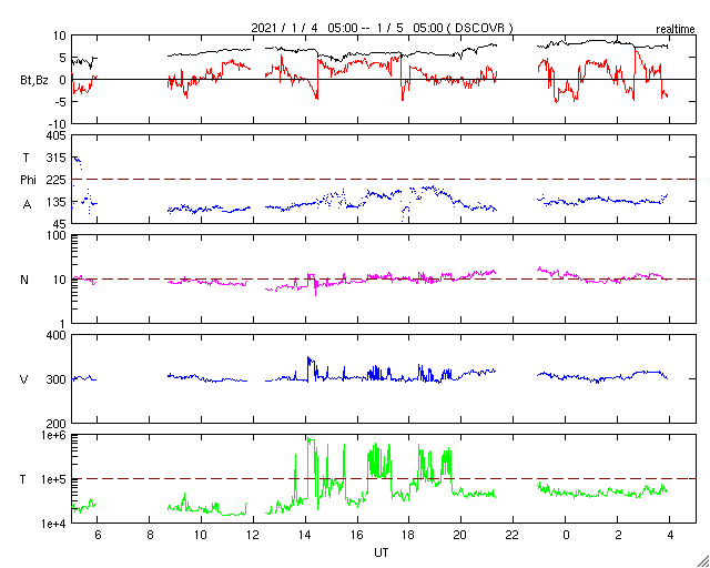 2021/ 1/ 5 13:08 更新 低速の太陽風が続き、磁気圏も静穏です。12月の黒点相対数は 21.8 でした。 担当 篠原 WDC-SILSOより、12月の黒点相対数の月平均値は 21.8 と発表されました。 11月の34.0からは下がっていますが、 1枚目のグラフを見ると、順調に増加が続いている印象です。 無黒点の日数は2日と、 11月の1日に続いてとても少ない状態でした。 一方、Cクラス以上のフレアの発生は、 月の前半だけに留まっていて、 後半からは現在に至るまで静かな状態が続いています。 フレアの本格的な増加がいつになるのかは、 今年の太陽活動の注目点でしょう。 その太陽は、今日も無黒点です。 SDO衛星AIA193では、明るく光る領域もなく、 活動はとても穏やかです。 STEREO Ahead衛星を見ても、 太陽の東端の向こう側に活動的な領域はなく、 無黒点の状態はしばらく続くかもしれません。 太陽風は、300〜310km/秒と低速の状態が続いています。 磁場強度は、5nTから8nTに少し高まっています。 磁気圏は静穏で、 AE指数は、小規模の変化が一時的に起きている程度です。 SDO衛星AIA193では、 西側に進んだ小型のコロナホールが見えにくくなっています。 影響が見られるとするとそろそろかと思いますが、 太陽風の変化は小規模に留まりそうです。 27日周期の図を見ると、 前周期の12月10日に太陽風の急な変化 (速度と磁場の高まり)が発生しています。 これは、世界時7日のC7.4の小規模フレアに伴って発生した CMEによる乱れが関係していると考えられます。 突発性の変化なので、 今後の太陽風を考える際には注意が必要です。 この変化の前に当たる9日の時点でも、 速度や磁場強度の弱い高まりが起きています。 この様な変化は今回も見られるかもしれません。 ![]() 太陽黒点相対数の長期変化。12月の黒点相対数は 21.8 でした。 (c) 黒点データ:WDC-SILSO、作図:宇宙天気ニュース ![]() 1970年以降の太陽黒点相対数の長期変化。 (c) 黒点データ:WDC-SILSO、作図:宇宙天気ニュース ![]() 1970年以降の月毎の無黒点日の日数。 (c) 黒点データ:WDC-SILSO、作図:宇宙天気ニュース ![]() SDO衛星のAIA193カメラによる太陽コロナの様子 (c) SDO (NASA) ![]() SDO衛星による太陽の可視光写真 (c) SDO (NASA) ![]() GOES衛星の太陽X線強度。赤・橙 = 0.1〜0.8 nm、青・紫 = 0.05〜0.4 nm (c) データ:NOAA/SWPC、作図:宇宙天気ニュース ![]() DSCOVRが観測した太陽風の磁場(1番上の枠、黒線は全体の強度、赤線は南北成分) および、太陽風の密度(3番目の紫線)、速度(4番目の青線) (c) データ:NOAA/SWPC、作図:宇宙天気ニュース ![]() AE指数(速報値) 下段のAEグラフの値が高くなると、オーロラ活動が活発化しています。 (c) 京都大学WDC ![]() ![]() 27日の太陽周期に合わせたデータプロット 太陽が同じ面を地球に向けていた27日前の変化から、今後を予想することができます。 (c) 作図:宇宙天気ニュース