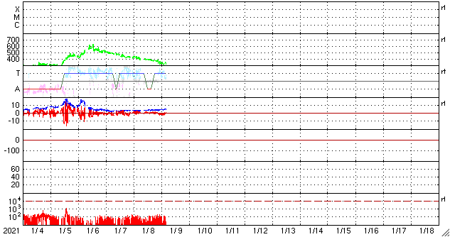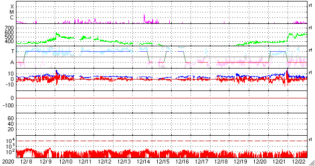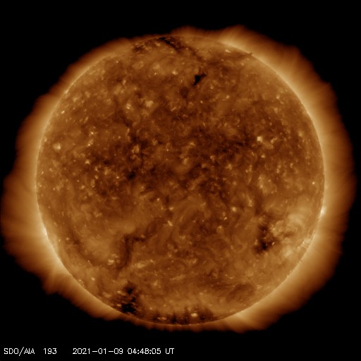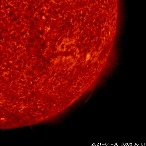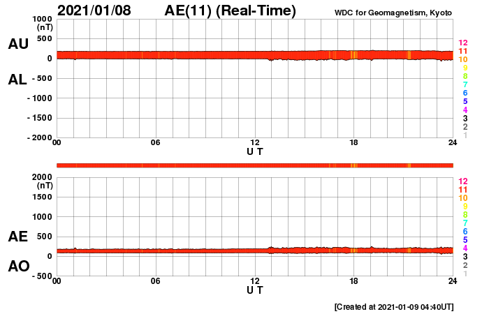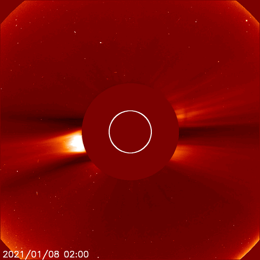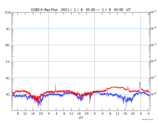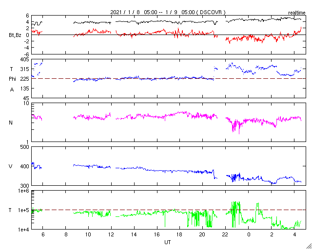 2021/ 1/ 9 13:55 更新 フィラメント噴出が発生しています。太陽風は低速になっています。 担当 篠原 昨日、8日12時(世界時8日3時)と8日21時(世界時8日12時)に、 半日ほどおいて2回のフィラメント噴出が 太陽の南西側(右下)で発生しました。 SDO衛星AIA304による動画を掲載します。 1つめは南寄り、2つめは西寄りの領域で起きています。 1つめのフィラメント噴出による CME(コロナ質量放出)の様子を、 SOHO衛星LASCO C2、C3の動画で紹介します。 きれいな円形のガスが太陽の右に向かって飛び出しています。 太陽の中心からは外れていますが、 4日後の13日くらいに 太陽風磁場の強まりなどがやって来るかもしれません。 2つめのCMEは、該当する時間帯の写真が得られていません。 今後の更新で確認できるかもしれません。 こちらも太陽の中心からは外れていますが、 1つめと同様に、磁場の強まりなどが到来する可能性があります。 今日も太陽は無黒点です。 X線グラフは、Aクラスの小さい変化が起きているだけで、 穏やかです。 太陽風は、今日に入る頃に速度が400km/秒台を割り、 現在は320km/秒と低速の風になっています。 磁場強度は、5nTと平均的な状態です。 磁気圏は静穏で、 AE指数は変化のない状態です。 SDO衛星AIA193では、 太陽の中央部にコロナホールは見られません。 太陽風は、基本的には穏やかな状態が続きそうです。 ![]() 太陽の南西部で発生した2つのフィラメント噴出。SDO衛星AIA304。 (c) SDO (NASA)、(動画加工 : 宇宙天気ニュース) ![]() 1つめのフィラメント噴出によるCMEの広がり。SOHO衛星LASCO C2、C3。 (c) SOHO (ESA & NASA)、 (動画加工 : 宇宙天気ニュース) ![]() SDO衛星のAIA193カメラによる太陽コロナの様子 (c) SDO (NASA) ![]() SDO衛星による太陽の可視光写真 (c) SDO (NASA) ![]() GOES衛星の太陽X線強度。赤・橙 = 0.1〜0.8 nm、青・紫 = 0.05〜0.4 nm (c) データ:NOAA/SWPC、作図:宇宙天気ニュース ![]() DSCOVRが観測した太陽風の磁場(1番上の枠、黒線は全体の強度、赤線は南北成分) および、太陽風の密度(3番目の紫線)、速度(4番目の青線) (c) データ:NOAA/SWPC、作図:宇宙天気ニュース ![]() AE指数(速報値) 下段のAEグラフの値が高くなると、オーロラ活動が活発化しています。 (c) 京都大学WDC ![]() ![]() 27日の太陽周期に合わせたデータプロット 太陽が同じ面を地球に向けていた27日前の変化から、今後を予想することができます。 (c) 作図:宇宙天気ニュース