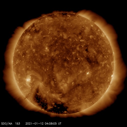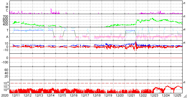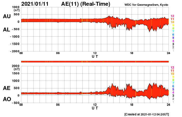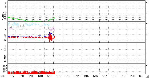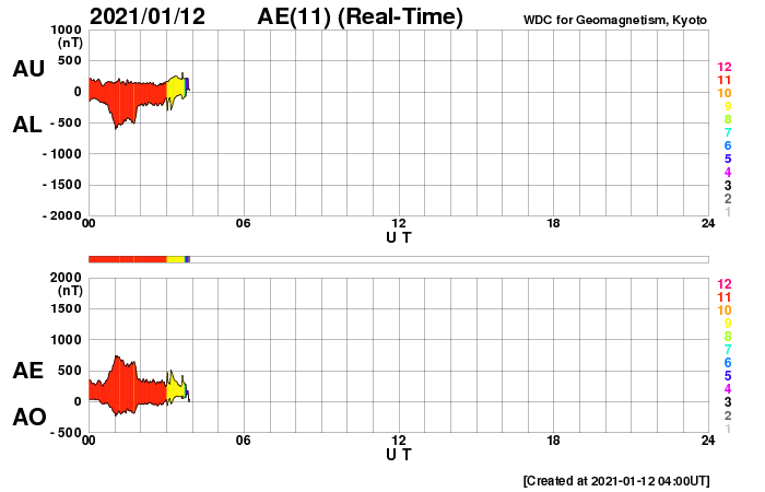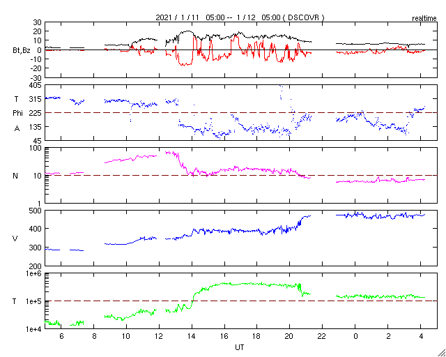2021/ 1/12 13:22 更新 太陽風の乱れが到来して磁気圏の活動を高めています。 担当 篠原 太陽風の乱れが到来しています。 昨夕、11日17時(世界時11日8時)頃に小幅の変化が到来し、 その後、11日23時(世界時11日14時)に磁場強度は20nTへ強まり、 今朝、12日6時(世界時11日21時)には、 速度も470km/秒とやや高速の状態に高まりました。 現在も速度は470km/秒で推移していますが、 磁場強度は5nTと平均的な状態まで下がっています。 3〜4日程度さかのぼって考えると、 9日のニュースでお知らせした 8日のフィラメント噴出による乱れかもしれません。 磁場の強まりが到来した頃に、 -10nTに達する強い南向きの変化が続きました。 この影響で磁気圏の活動が高まり、 AE指数は800nT前後の中規模の変化が数時間続いています。 この頃の太陽風の速度は380km/秒とやや低速だったので、 磁気圏の乱れもこの程度になったのかもしれません。 今朝以降は、磁場の南北成分は0nT付近に下がっています。 そのため、AE指数の変化も次第に小幅になっています。 今回の乱れがCMEによるものであれば、 速度の高まりは短い時間で終わりそうです。 現在の状態はどこまで続くでしょうか。 太陽は、無黒点で穏やかです。