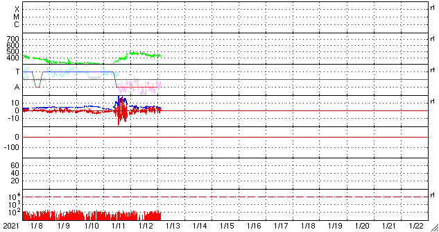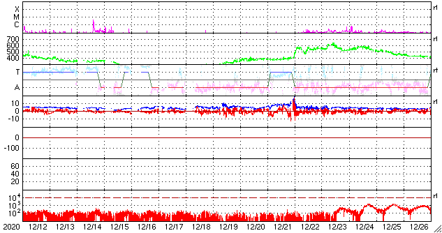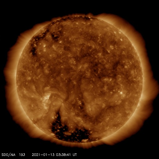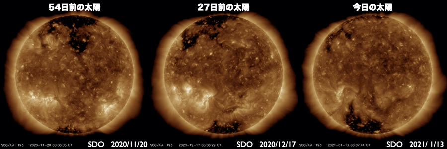 2021/ 1/13 12:45 更新 太陽風の速度は下がっています。磁気圏は穏やかです。 担当 篠原 昨日の夜くらいから太陽風の速度は下がり、 430km/秒と平均的な状態に戻っています。 磁場強度も、5nTから3nTへ下がり気味です。 磁場の南北成分は、 昨日のニュース以降は、0nT付近か北寄りになっています。 磁気圏は穏やかになっていて、 AE指数の図の後半は変化がなくなっています。 太陽風の乱れは、1〜2日程度で終わりとなりそうです。 SDO衛星AIA193を見ると、 南極から中緯度くらいまでコロナホールが縦に伸びています。 前周期や2周期前の太陽を見ると(1枚目の図)、 コロナホールは次第に低緯度側に伸びてきた様です。 4〜5日後くらいから、この領域の影響が始まるかもしれません。 一方、北半球のコロナホールも動いていて、 2周期前に北極から縦に伸びていたコロナホールは、 前周期には東寄り(左寄り)に動き、 現在はさらにその向こうに動いている様です。 27日周期の図では、 前周期の12月22日から速度の高まりが始まっていますが、 今回は様子が変わりそうです。 太陽は、今日も無黒点です。 今月の初めに2794、2795群が没して以来、 無黒点と言ってよい状態が続いています。