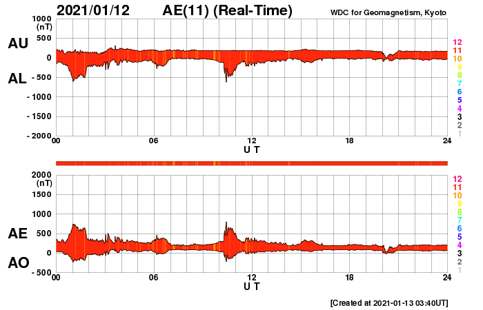 (c) SDO (NASA)、作図:宇宙天気ニュース ![]() SDO衛星のAIA193カメラによる太陽コロナの様子 (c) SDO (NASA) ![]() SDO衛星による太陽の可視光写真 (c) SDO (NASA) ![]() DSCOVRが観測した太陽風の磁場(1番上の枠、黒線は全体の強度、赤線は南北成分) および、太陽風の密度(3番目の紫線)、速度(4番目の青線) (c) データ:NOAA/SWPC、作図:宇宙天気ニュース ![]() AE指数(速報値) 下段のAEグラフの値が高くなると、オーロラ活動が活発化しています。 (c) 京都大学WDC ![]() ![]() 27日の太陽周期に合わせたデータプロット 太陽が同じ面を地球に向けていた27日前の変化から、今後を予想することができます。 (c) 作図:宇宙天気ニュース