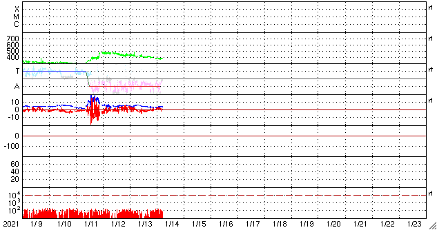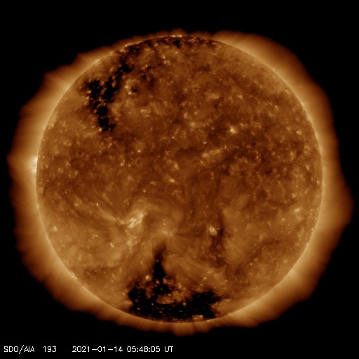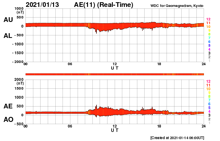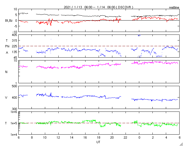 2021/ 1/14 15:00 更新 太陽風はやや低速に下がり、磁気圏も穏やかです。 担当 篠原 太陽風の速度は380km/秒へ下がり、 やや低速になっています。 磁場強度も、3〜4nTとやや弱い状態です。 磁場の南北成分は、 弱い南寄りから弱い北寄りに変化しています。 AE指数は、前半は小さい変化が続いていますが、 後半からは静かになっています。 速度も下がってきたので、穏やかな状態が続きそうです。 SDO衛星AIA193では、 南半球のコロナホールが中央線くらいに達しています。 3〜4日後くらいに影響がやって来るかもしれません。 緯度が高めなので、どの程度の変化になるかも注目してください。 また、北半球のコロナホールも北東側に見えています。 こちらの影響も続いて到来しそうです。 太陽は無黒点で、穏やかです。 ![]() SDO衛星のAIA193カメラによる太陽コロナの様子 (c) SDO (NASA) ![]() SDO衛星による太陽の可視光写真 (c) SDO (NASA) ![]() DSCOVRが観測した太陽風の磁場(1番上の枠、黒線は全体の強度、赤線は南北成分) および、太陽風の密度(3番目の紫線)、速度(4番目の青線) (c) データ:NOAA/SWPC、作図:宇宙天気ニュース ![]() AE指数(速報値) 下段のAEグラフの値が高くなると、オーロラ活動が活発化しています。 (c) 京都大学WDC ![]() ![]() 27日の太陽周期に合わせたデータプロット 太陽が同じ面を地球に向けていた27日前の変化から、今後を予想することができます。 (c) 作図:宇宙天気ニュース
