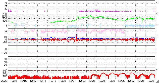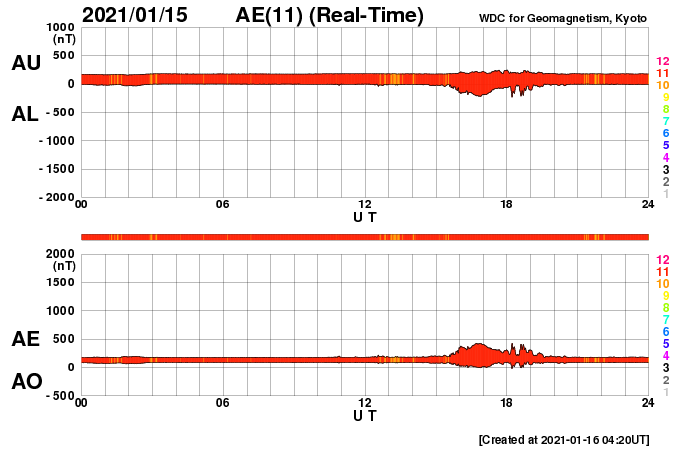 (c) SDO (NASA) ![]() SDO衛星による太陽の可視光写真。マウスの矢印を写真に重ねると、黒点番号付きの写真に切り替わります。 (c) SDO (NASA) ![]() GOES衛星の太陽X線強度。赤・橙 = 0.1〜0.8 nm、青・紫 = 0.05〜0.4 nm (c) データ:NOAA/SWPC、作図:宇宙天気ニュース ![]() DSCOVRが観測した太陽風の磁場(1番上の枠、黒線は全体の強度、赤線は南北成分) および、太陽風の密度(3番目の紫線)、速度(4番目の青線) (c) データ:NOAA/SWPC、作図:宇宙天気ニュース ![]() AE指数(速報値) 下段のAEグラフの値が高くなると、オーロラ活動が活発化しています。 (c) 京都大学WDC ![]() ![]() 27日の太陽周期に合わせたデータプロット 太陽が同じ面を地球に向けていた27日前の変化から、今後を予想することができます。 (c) 作図:宇宙天気ニュース