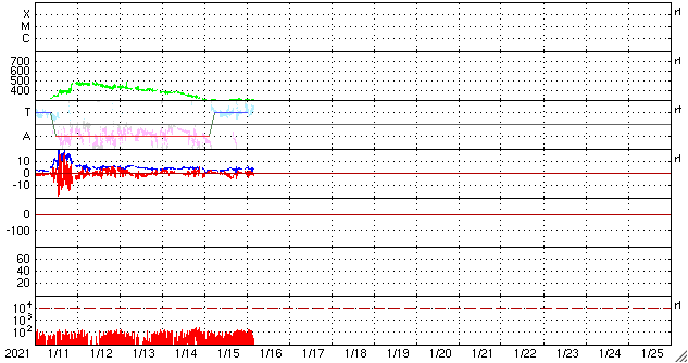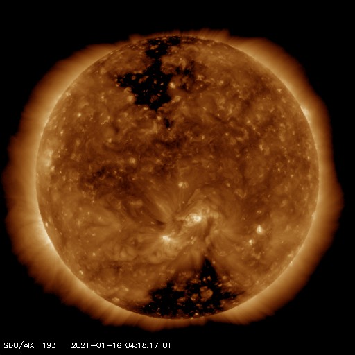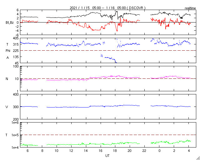 2021/ 1/16 13:36 更新 小さい黒点は2796黒点群になりました。太陽風は低速です。 担当 篠原 太陽の中央部に現れた黒点が少し大きくなり、 2796群と番号が付けられています。 太陽に群番号が付けられた黒点が見えているのは、 1月3日以来で、2週間ぶりです。 もう一つ見えていた小さい黒点は、 昨日のニュースの後に少し大きくなりましたが、 現在はまた小さくなっていて、 SDO衛星の可視光写真を拡大すると見えるくらいです。 また、STEREO Ahead衛星によると、 東端の向こう側から活動的な領域が近づいています。 SDO衛星のAIA193でも、 南東の端(左下)が少し明るくなっています。 どの様な領域が現れるでしょうか。 太陽風は、300km/秒の低速の風が続いています。 磁場強度は、2nTから4nTに上がり、平均的な状態です。 磁場の南北成分は、グラフの中盤で南向きに変化しています。 速度が下がっているので、磁気圏への影響は小さかったのですが、 AE指数には300nT程度の小規模の変化が発生しています。 その他の時間帯は穏やかです。 SDO衛星AIA193では、 南極から広がるコロナホールが太陽の西側に進んでいます。 この後、この領域の影響がやって来るでしょうか。
