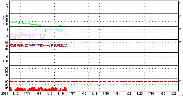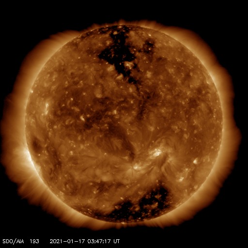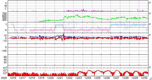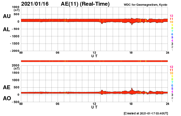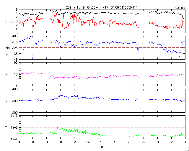 2021/ 1/17 12:57 更新 低速の太陽風が続いています。太陽の東端から新しい黒点が現れています。 担当 篠原 太陽風は、小幅の変化は見られますが、 全体としては300km/秒の低速の状態が続いています。 磁場強度は、4nT前後で安定しています。 磁場の南北成分は、 グラフの中盤以降は弱い南寄りになっています。 ただし、速度がだいぶ下がっているので、 磁気圏への影響は小さく、 AE指数は小さい変化が見られる程度です。 SDO衛星AIA193では、 南極から広がるコロナホールが西に進み、 そろそろ影響が始まってもよい頃です。 27日周期の図を見ると、 前周期は12月22日から太陽風の速度が高まっています。 これは、北極から伸びているコロナホールの影響の様で、 そろそろ回帰しそうですが、 現在はコロナホールの位置が少し左側に動いているため、 速度の変化は少し遅れて到来するかもしれません。 太陽は、南東の端から新しい黒点が上がってきた様です。 かろうじて見える程度で、まだ詳細は分かりません。 X線グラフは全体の強度が少し上がっていますが 東端から現れた領域の影響でしょう。 どの様な活動度の領域でしょうか。