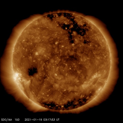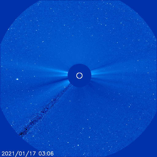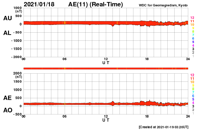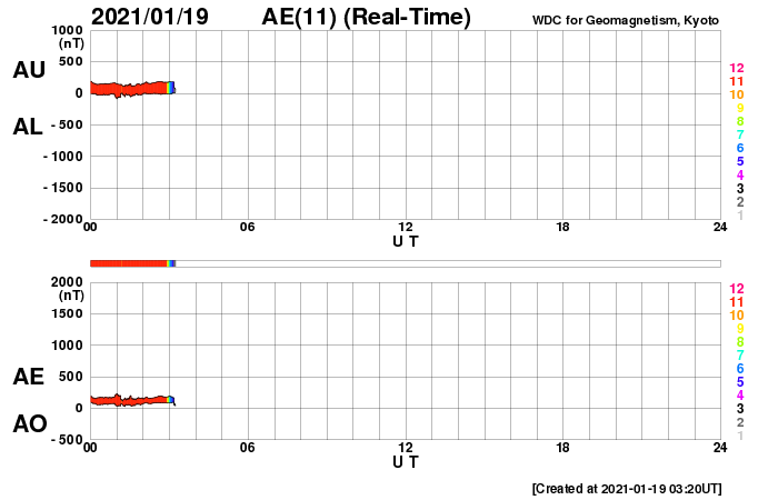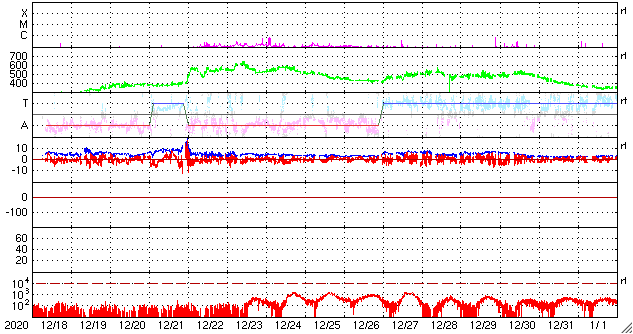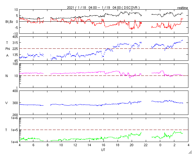 2021/ 1/19 12:28 更新 太陽に彗星が近づいています。低速の太陽風が続いています。 担当 篠原 SOHO衛星のLASCO C3、C2カメラで、 太陽に接近する彗星が撮影されています。 1枚目に動画を掲載します。 左下から長く尾をひいた彗星が近づいていますが、 よく見ると、右下の方からも小さい彗星が太陽に向かっています。 宇宙天気とは関係ない話題ですが、 SOHO衛星の画像を見ていると、 時々、こんな光景を眺めることができます。 太陽風は低速の状態が続いています。 速度は、昨日の280km/秒から300km/秒に少し上がった程度です。 磁場強度は、グラフの中盤から5〜7nTと少し強まっています。 その頃から南北成分は南向きに振れていますが、 速度がかなり下がっているため、 磁気圏は穏やかな状態が続いていて、 AE指数は小さい変化が起きている程度です。 SDO衛星AIA193では、北半球のコロナホールが西に進み、 影響が到来してもよい頃です。 この後、速度の高まりが始まるかもしれません。 また、太陽の東側の南半球側に、 コロナホールの薄暗い領域が丸く見えています。 影響はもうしばらく先ですが、この領域も注目してください。 太陽は、南東に現れた2797黒点群が よく見える様になっています。 X線グラフの変化はなく、活動は穏やかです。 ![]() 太陽に接近する彗星。SOHO衛星LASCO C3、C2による。 (c) SOHO (ESA & NASA)、 (動画加工 : 宇宙天気ニュース) ![]() SDO衛星のAIA193カメラによる太陽コロナの様子 (c) SDO (NASA) ![]() SDO衛星による太陽の可視光写真。マウスの矢印を写真に重ねると、黒点番号付きの写真に切り替わります。 (c) SDO (NASA) ![]() DSCOVRが観測した太陽風の磁場(1番上の枠、黒線は全体の強度、赤線は南北成分) および、太陽風の密度(3番目の紫線)、速度(4番目の青線) (c) データ:NOAA/SWPC、作図:宇宙天気ニュース ![]() AE指数(速報値) 下段のAEグラフの値が高くなると、オーロラ活動が活発化しています。 (c) 京都大学WDC ![]() ![]() 27日の太陽周期に合わせたデータプロット 太陽が同じ面を地球に向けていた27日前の変化から、今後を予想することができます。 (c) 作図:宇宙天気ニュース