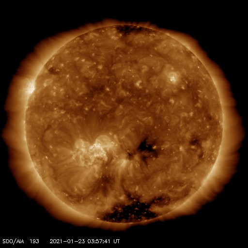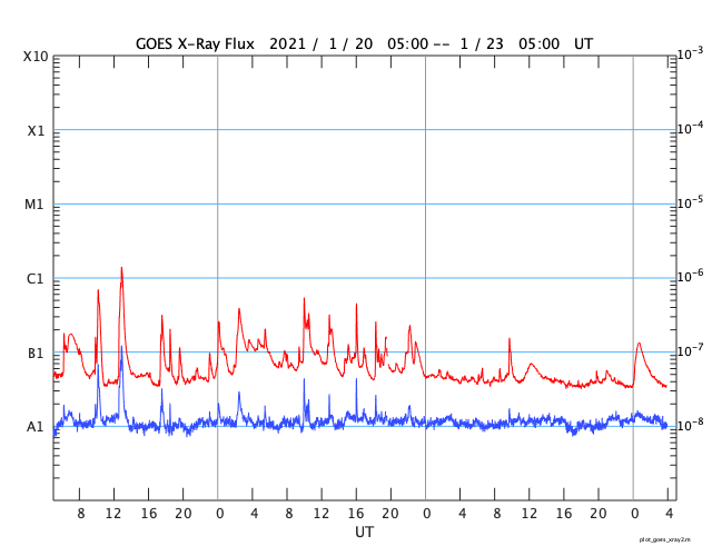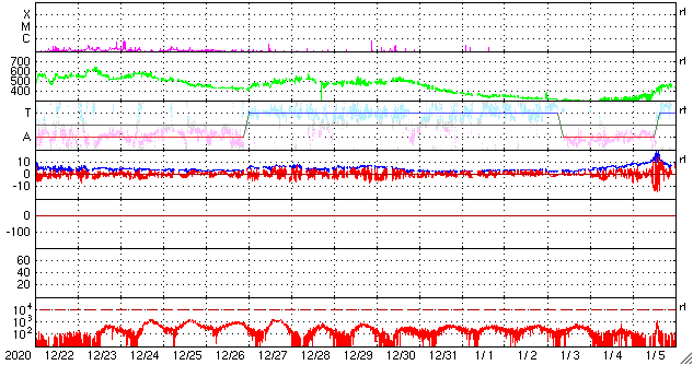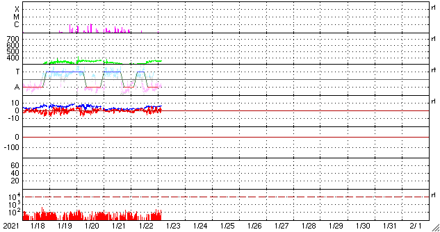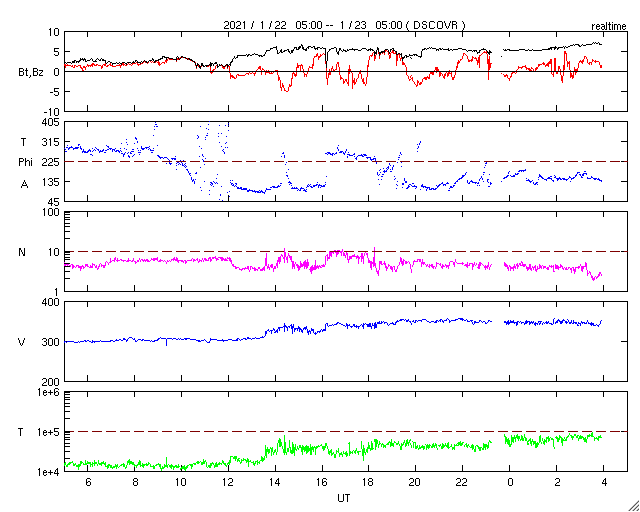 2021/ 1/23 13:08 更新 新しい黒点が現れています。太陽風は低速で、磁気圏も穏やかです。 担当 篠原 昨日の昼過ぎから太陽の北西部(右上)に新しい黒点が出現し、 2799群と番号が付けられています。 一方、小さいフレアを起こしていた2798群は、 黒点が小さくなっていて、 掲載の写真では微かに見える程度です。 フレアの頻度も下がっていて、 X線グラフは静かになっています。 SDO衛星AIA193を見ると、 北東の端(左上)から明るい領域が現れています。 今のところ黒点は見えない様ですが、 しばらく注目してください。 太陽風は、300km/秒から340km/秒へ 少し速度が上がっています。 低速の状態は続いています。 磁場強度も2nTから5nTに上がり、 こちらは平均的な状態です。 グラフの最後で7nTに上がる変化が見えていますが、 この傾向は続くでしょうか。 磁気圏は静穏で、 AE指数は小さい変化が見られる程度です。 27日周期の図の前周期の太陽風を見ると、 ちょうど27日前の12月27日以降、 速度が高めの状態になっています。 これから同様の変化が見られるでしょうか。