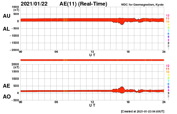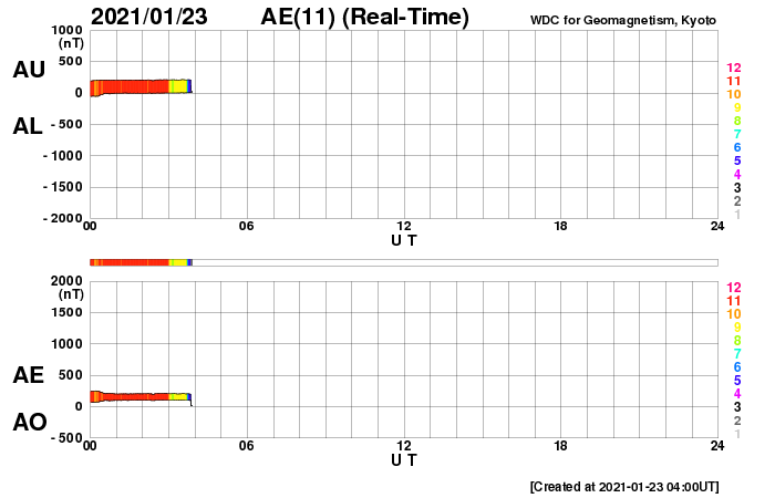 (c) SDO (NASA) ![]() SDO衛星による太陽の可視光写真。マウスの矢印を写真に重ねると、黒点番号付きの写真に切り替わります。 (c) SDO (NASA) ![]() GOES衛星の太陽X線強度。赤・橙 = 0.1〜0.8 nm、青・紫 = 0.05〜0.4 nm (c) データ:NOAA/SWPC、作図:宇宙天気ニュース ![]() DSCOVRが観測した太陽風の磁場(1番上の枠、黒線は全体の強度、赤線は南北成分) および、太陽風の密度(3番目の紫線)、速度(4番目の青線) (c) データ:NOAA/SWPC、作図:宇宙天気ニュース ![]() AE指数(速報値) 下段のAEグラフの値が高くなると、オーロラ活動が活発化しています。 (c) 京都大学WDC ![]() ![]() 27日の太陽周期に合わせたデータプロット 太陽が同じ面を地球に向けていた27日前の変化から、今後を予想することができます。 (c) 作図:宇宙天気ニュース