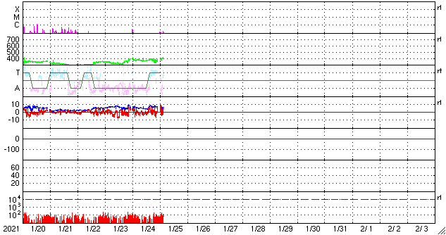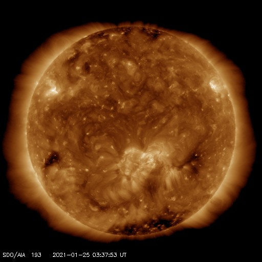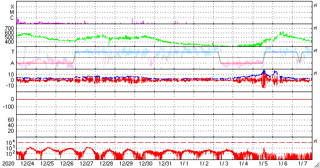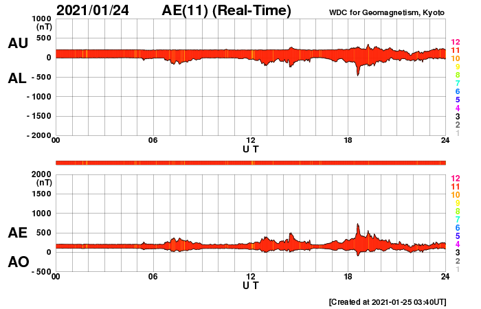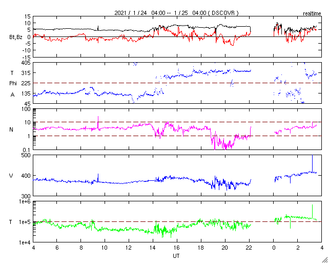 2021/ 1/25 12:50 更新 太陽風は平均的な速さになっています。 担当 篠原 太陽風は、360〜380km/秒の低速の風が続いていましたが、 グラフの最後で400km/秒と平均的な速さに上がっています。 磁場強度は、5nTから8nTに少し上がって、 最後は5nT前後に戻っています。 どちらも小さい変化で、 27日周期の図の前周期に見られた高速の太陽風は、 今回は到来していません。 磁気圏も概ね静穏で、 AE指数は小規模の変化が見られる程度です。 SDO衛星AIA193では、 南東の端(左下)にコロナホールの暗い領域が見えています。 やや見にくいですが、北東の端(左上)にも暗い領域があります。 次の太陽風の高まりは、これらの影響になるかもしれません。 27日周期の図の前周期の1月5日に始まる変化の回帰です。 太陽は、北西(右上)の2799群が少し大きくなっています。 X線グラフも小さい変化が見られる様になっていますが、 この後、西の端に沈んで行きます。 ![]() SDO衛星のAIA193カメラによる太陽コロナの様子 (c) SDO (NASA) ![]() SDO衛星による太陽の可視光写真。マウスの矢印を写真に重ねると、黒点番号付きの写真に切り替わります。 (c) SDO (NASA) ![]() DSCOVRが観測した太陽風の磁場(1番上の枠、黒線は全体の強度、赤線は南北成分) および、太陽風の密度(3番目の紫線)、速度(4番目の青線) (c) データ:NOAA/SWPC、作図:宇宙天気ニュース ![]() AE指数(速報値) 下段のAEグラフの値が高くなると、オーロラ活動が活発化しています。 (c) 京都大学WDC ![]() ![]() 27日の太陽周期に合わせたデータプロット 太陽が同じ面を地球に向けていた27日前の変化から、今後を予想することができます。 (c) 作図:宇宙天気ニュース