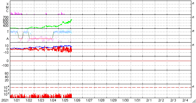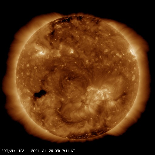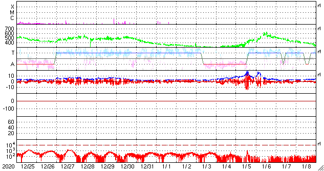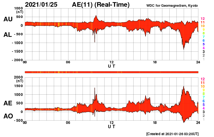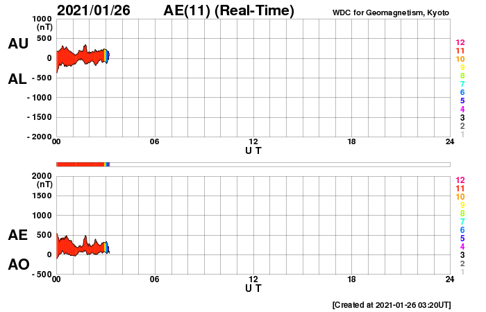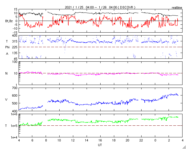 2021/ 1/26 12:31 更新 600km/秒の高速太陽風が到来し、磁気圏の活動も高まっています。 担当 篠原 太陽風の速度は、昨夕に500km/秒程度に高まり、 高速の風に変わりました。 そして、今日の昼頃からは600km/秒に達しています。 太陽風の磁場強度も、 昨日のニュース以降は10nTに強まりました。 今朝くらいから少し下がって、 現在は7nTとなっています。 磁場が強まるとともに、南北成分の変化も大きくなり、 -8nT程度の南向きの変化が度々発生するようになりました。 速度が高まったことも重なって磁気圏の活動は活発になり、 AE指数は1000nT前後の大きい変化が繰り返し発生しています。 極域では活発なオーロラの活動が見られたのではないでしょうか。 27日周期の図では、 太陽風の推移は前周期とだいぶ変わっています。 高速太陽風はどこまで続くでしょうか。 今後の推移に注目してください。 太陽は、2799黒点群が西の端に近づいて、 もうすぐ沈みそうです。 X線グラフのBクラスの変化は、この2799群で発生しています。 一方、中央部の北半球側に非常に小さい黒点が現れています。 発達するでしょうか。 STEREO Ahead衛星によると、 太陽の東端の向こう側に活動的な領域はない様です。 太陽は、穏やかな状態が続きそうです。