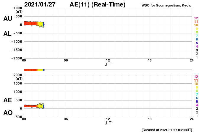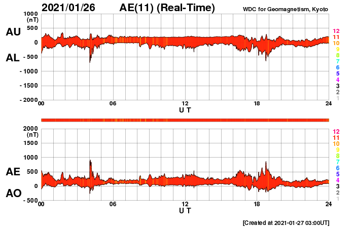 下段のAEグラフの値が高くなると、オーロラ活動が活発化しています。