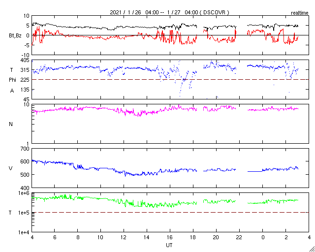 2021/ 1/26 12:31 600km/秒の高速太陽風が到来し、磁気圏の活動も高まっています。