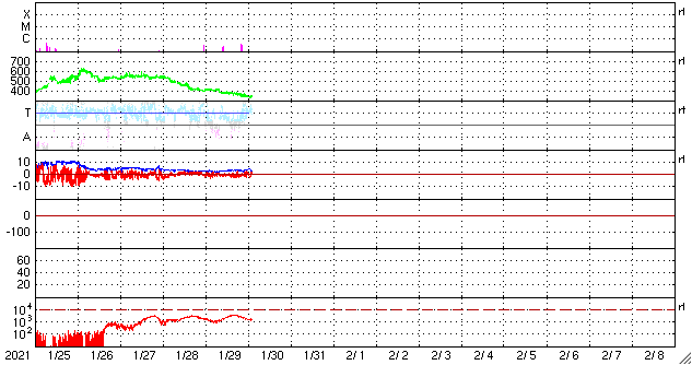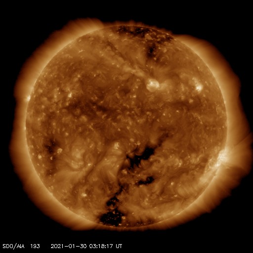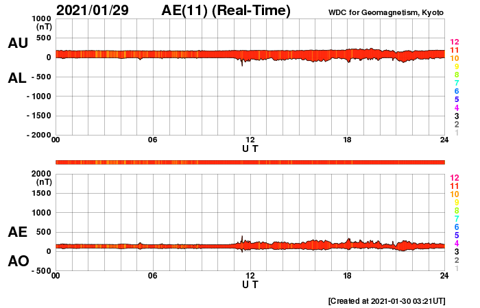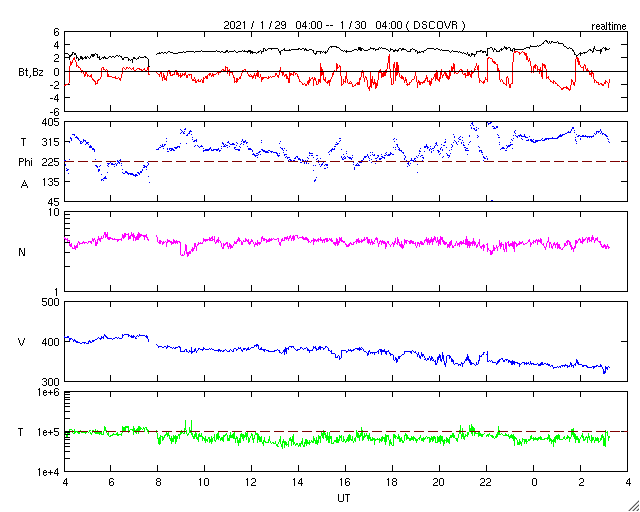 2021/ 1/30 12:31 更新 太陽風は低速になっています。磁気圏も穏やかです。 担当 篠原 太陽風の速度は、 昨日の午後に400km/秒台を割って低速風になり、 現在は340km/秒まで下がっています。 磁場強度は3nTとやや弱い状態です。 磁気圏も穏やかで、 AE指数は小さい変化が見られる程度です。 SDO衛星AIA193では、 南半球を縦に伸びるコロナホールが西半球側に進んでいます。 明後日くらいからこの領域の影響で 太陽風が強まる可能性があります。 太陽は今日も無黒点です。 X線グラフでは、 Bクラスの小さいフレアが、半日間隔で3回発生しています。 これらは、SDO衛星AIA193の北西側(右上)で明るく見える 2800黒点群があった領域で発生しています。 SOHO衛星によると、 太陽の右に向かって弱いCME(コロナ質量放出)も起きています。 ![]() SDO衛星のAIA193カメラによる太陽コロナの様子 (c) SDO (NASA) ![]() SDO衛星による太陽の可視光写真 (c) SDO (NASA) ![]() DSCOVRが観測した太陽風の磁場(1番上の枠、黒線は全体の強度、赤線は南北成分) および、太陽風の密度(3番目の紫線)、速度(4番目の青線) (c) データ:NOAA/SWPC、作図:宇宙天気ニュース ![]() AE指数(速報値) 下段のAEグラフの値が高くなると、オーロラ活動が活発化しています。 (c) 京都大学WDC ![]() ![]() 27日の太陽周期に合わせたデータプロット 太陽が同じ面を地球に向けていた27日前の変化から、今後を予想することができます。 (c) 作図:宇宙天気ニュース